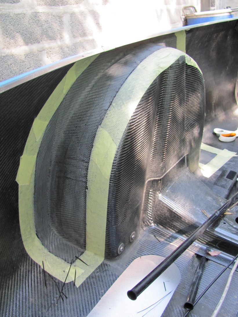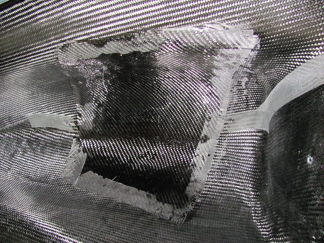 Laminoinnit on siis tehty (paitsi jos en rupea hienostelemaan yhden hieman epäonnistuneen paikan kanssa) ja ihan hyvin ne tuntui onnistuvan. Ihan tavallisella kontaktimuovilla koitin sitoa kuoren ulkopuolelta muotoonsa ja sitten sisäpuolelle laitettiin paikasta riippuen kaksi tai kolme kerrosta 200g/m2 hiilikuitumattoa. Hiilikuitupaikat ylittivät vauriokohdat noin 5 cm matkalta minkä pitäisi hyvin riittää siihen että kankaan kapasiteetti ei jää tartunnasta kiinni.