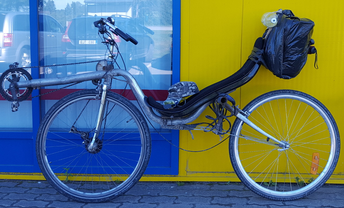 Olen erittäin tyytyväinen sateenpitävään laukkuuni, joka oli kiinnitetty varasisärenkaalla istuimen selkänojaan. Vararenkaan alempi lenkki kiersi kerran istuimen ympäri ja ylempi kiinnittyi niskatuen runkoon, jona toimi 30 cm pätkä rimaa nippusiteillä kiinni istuimessa. Niskatuen pehmusteena toimi litran juomapullo.