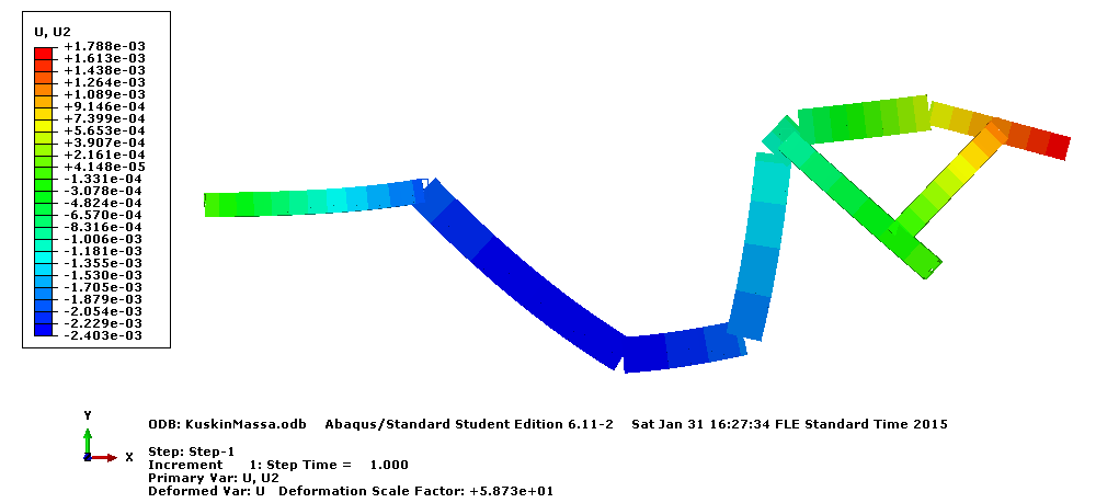 Mistä, ja miten tuo sinun mallisi oli tuettu maahan, kun siirtymät näkyvät olevan etu ja takahaarukan dropparien kohdalla erilaiset. Luulisi, että ne pysyvät paikoillaan ainakin pystysuunnan suhteen ja toinen vaakasuuntaankin. Nyt näyttäisi olevan paikoillaan (värikoodeissa tumma sininen) vain etupuomin keskiosa.