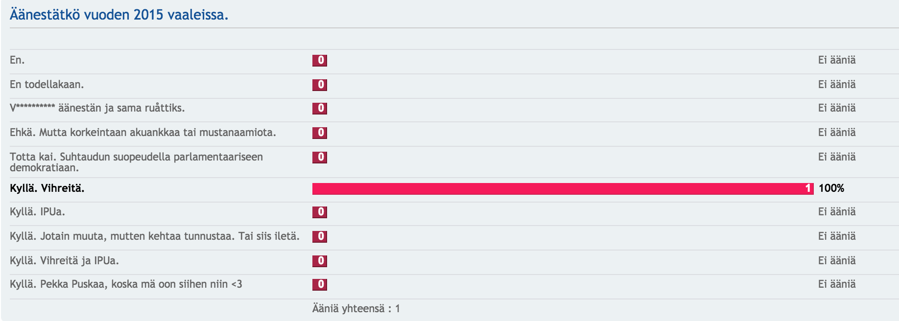 Tän gallupin mukaan vihreet saa 100% äänistä. Onks tää joku diktatuuri?