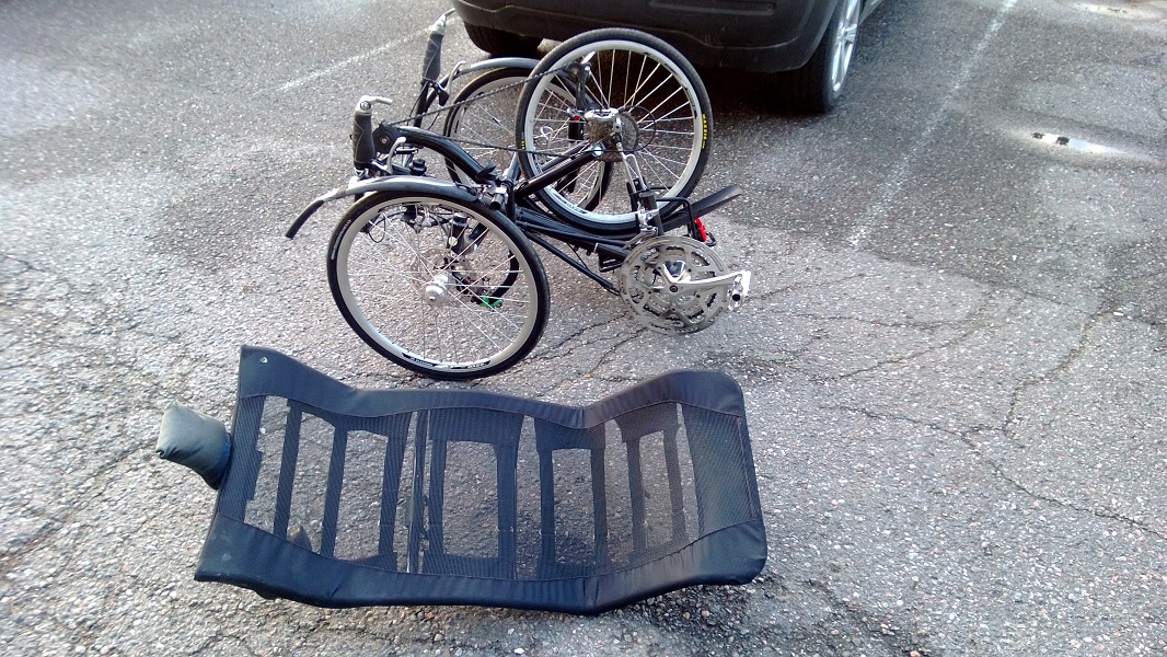 Piti saada helposti viikattava pyörä autolla kuskattavaksi (pitäähän autossa varapyörä olla) ja sitä Kilometrikisa-ketjussa kyselin olisiko jollain ylimääräistä ja Baskerilta löytyi. Hinta oli kohtuullinen ja pyörä tuli sillä kaupalla, että pientä laittoa saattaa olla mutta aika vähällä säätämisellä ja parilla ruuvilla siitä sai soivan pelin. Taitto onnistuu löysäämällä kolme pikalinkkua, vetämällä penkin pois ja sitten vaan taittaa perän eteenpäin ja paketti on valmis, samassa ajassa laittaa kyytiin kun maastopyöränkin.