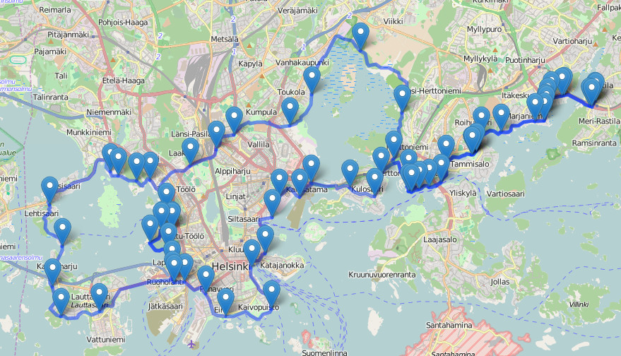 Tässä olisi lauantain hitaampi lenkki luonnosteltuna. Reitin lopulliseen kuntoon viilauksessa voi tulla vähän lisää tai poistua vähän kilometrejä. Kuvassa niitä on 50. Mahdollisuus helposti lisätä tai vähentää 10 km. Suunnitellut pysähdyspaikat velodromi, Käpylän lippakioski, Haltiala, Malmin lentoasema ja/tai Fallkulla ja Kahvila Kampela Vuosaaressa.