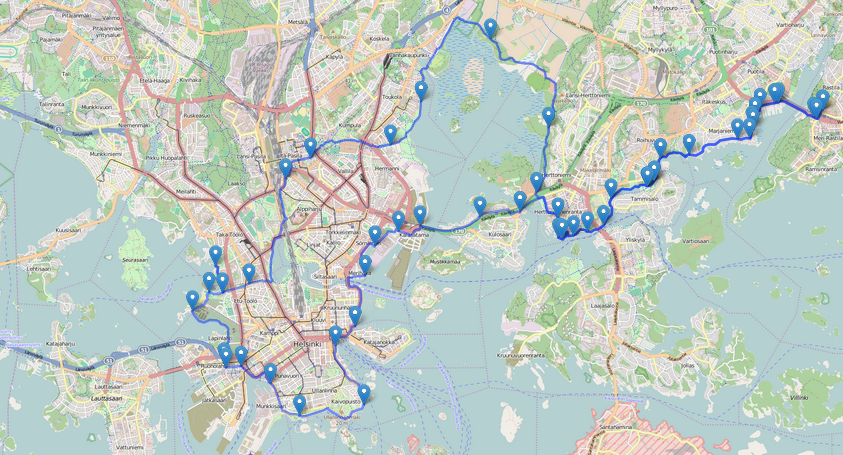 Tässä olisi lauantain hitaampi lenkki luonnosteltuna. Reitin lopulliseen kuntoon viilauksessa voi tulla vähän lisää tai poistua vähän kilometrejä. Kuvassa niitä on 50. Mahdollisuus helposti lisätä tai vähentää 10 km. Suunnitellut pysähdyspaikat velodromi, Käpylän lippakioski, Haltiala, Malmin lentoasema ja/tai Fallkulla ja Kahvila Kampela Vuosaaressa.