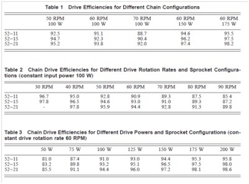 Osin siksi etsin tuohon perään suorille ketjuvälityksille tehdyn taulukon, joka kertoo, että rullaketjuvälityksen vastuksista iso osa on ketjulenkkien hankausta ketjupyörän hampaiden sivuihin ja muuhun ketjun rattaille ohjautumiseen liittyvää vastusta ja siksi hyötysuhde on sitä parempi, mitä kovemmalla teholla poljetaan. Varsnaisen tehon välittämiseet rullaketju on siis erittäin hyvähyötysuhteinen väline.