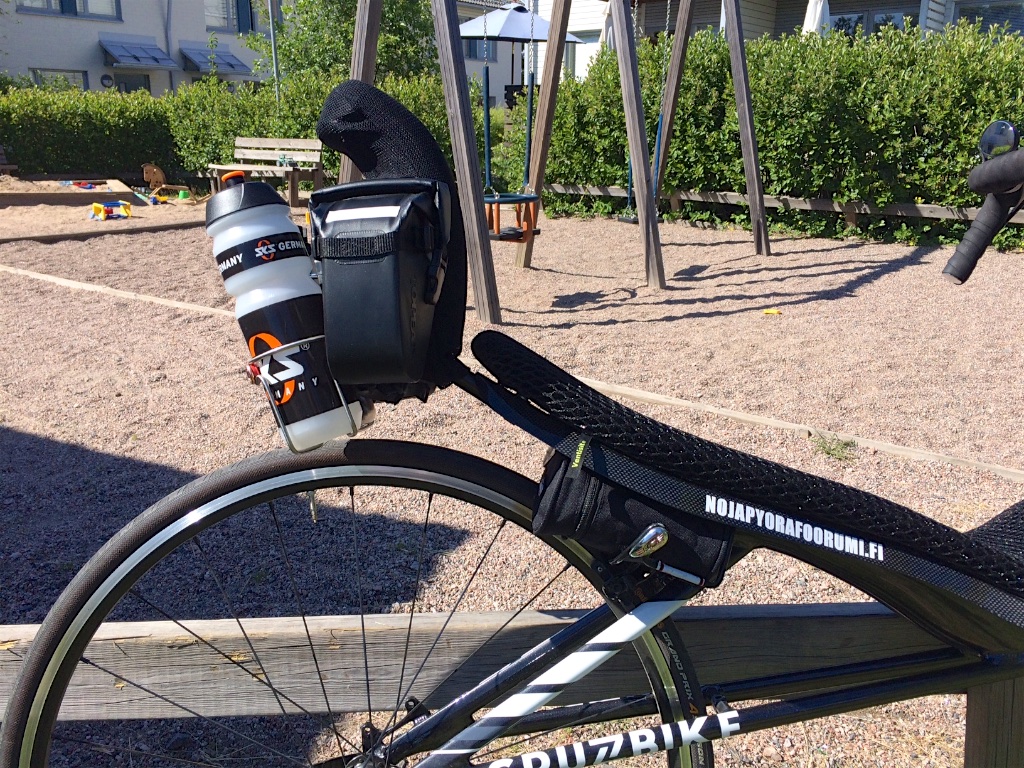 Niskan takana on Cruzbike foorumilta löydetty idea. Siellä paikka kahdelle pullotelineelle (Cruzbike Headrest Cage Mount Kit), siihen ja niskatuen putkeen kiinnitetty molemmin puolin vedenpitävät ns. satulalaukut. Pullotelineiden välissä vielä takavalo. Aika hienosti sai paljon kamaa ilmanvastuksen kannalta hyvin laitettua. Ja vielä on takarenkaan etupuolella kolmio tyhjänä, siihen sopiva laukku hakusessa, samasta satulalaukusta isoin malli saattais sopia.
