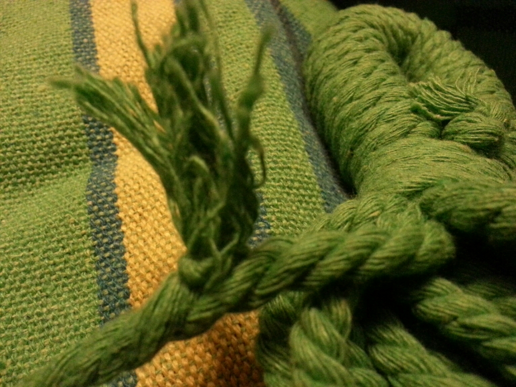 Nyörit eivät ole laadukkaat, kuten kuva näyttää. Pientä puneen löysyyttä on muualla ja yksittäinen lanka on poikki muualla. Palauttamassani punakeltaisessa oli puolet nyöristä poikki. Ajattelin, että tämänkään elinikä ei ehkä ole pitkä, mutta jos tuon kohdan ympäri sitoisi apupätkän, ei ehkä haittaa. Mitä olette mieltä, onko tuo kestävä noin tai tuleeko ongelmaa, jos taittaa ongelmakohdan ja sitoo painon kantavan köyden molemmille puolille vaurioitunutta kohtaa.