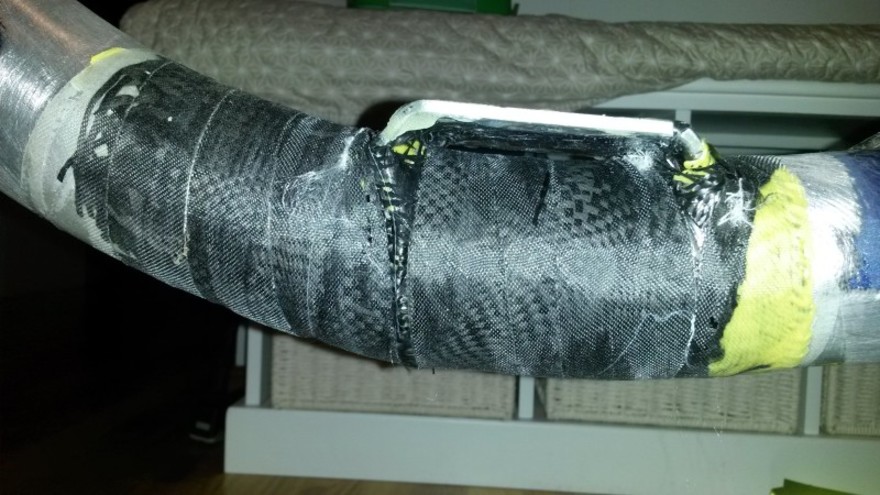 Uusi paikka on noin 60g hiilikuitua, ristiin pyöritellen noin kuusi kerrosta. Epoksia 100g josta isoin osa puristuu ulos karherikankaan läpi, vakuumisäkitystekniikalla tein. Lopuksi päälle uusi suosikkini, siveltävä polyuretaanilakka. Antaa hienon pinnan ja uv suojauksen