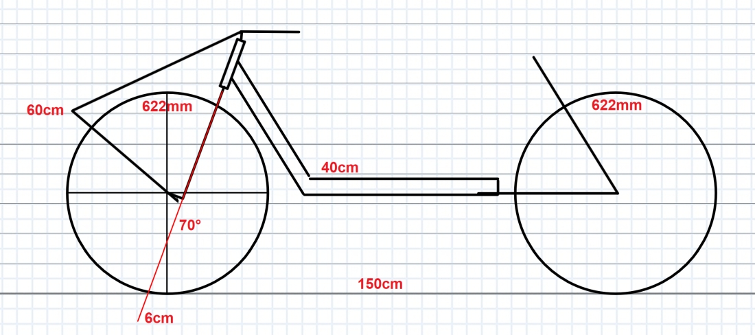 Otin mallia foorumin sporttisemmista MBB-pyöristä. Mittasin kaikki osat, joita aikoisin käyttää, ja piirsin niiden pohjalta. Eturunko yksinkertaisesti pystärin keulasta, johon kiinni pystärin ketjuputket ja satulaputki. Satulaputki kiinni stemmiin vaikka klemmarilla. Päärunko jotain palkkia. Mikä olisi riittävän jäykkää, jottei pyörä ole lötkö, mutta mieluusti silti suht kevyttä? 50501,5? Pyöreä 501,5? Olisiko 4060*1,5 parempi, jos sellaista löytää? Entä löytääkö ovaalipalkkeja mistään? Googlailemalla heikosti mitään pieniä määriä. Pitää soitella metallikauppaan. Takana taas pystypyörän takakolmio ilman satulaputkea. Mitenkäs tuo ohjauskulma ja jättö? Ohjauskulmaa voisi helposti loiventaa, mutta silloin jättö kasvaa, ja offsetin muuttaminen olisi taas oma projektinsa.