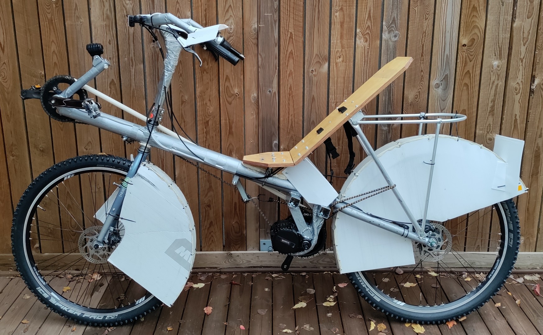 Tämä pyörä sai sähköt. Penkin alla on erillinen poljinkeskiöputki, johon moottori kiinnittyy. Olisihan tuohon penkin alle sopinut napamoottori, ehkä paremminkin, mutta poljinkeskiömoottori löytyi valmiiksi niin sillä mentiin.