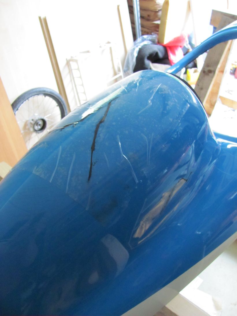 Pakkelina käytin nojailijan tuomia fenolipalloja joita sekoitettiin laminointi epoksiin sen verran että se selvästi paksuni ja muuttui tahnaksi. Sitä sitten siveltiin ulkopinnan avarrettuihin ja hiottuihin halkeamiin. Fenolipalloepoksi oli aika mukavasti hiottavissa ja toivottavasti pysyy paremmin kiinni eikä halkeile kuin tavallinen autopakkeli.