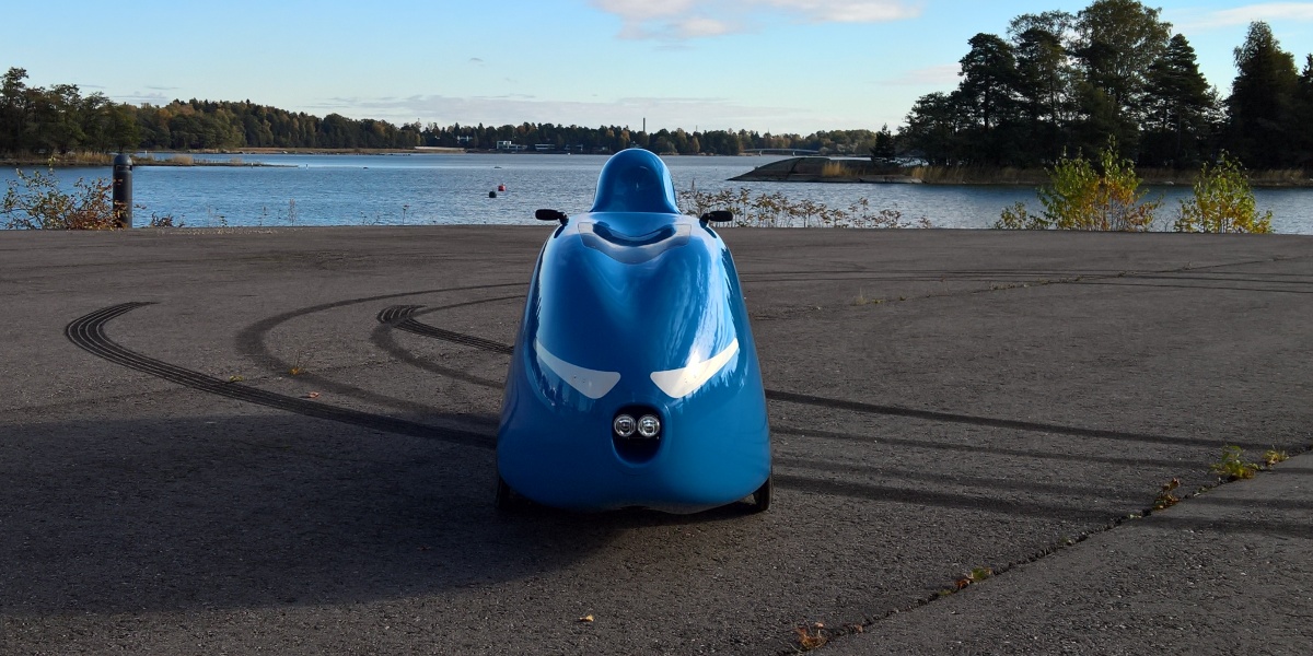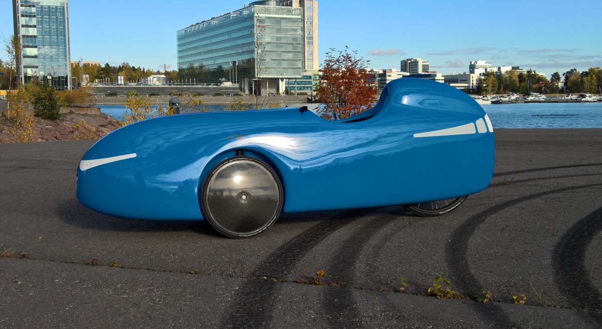 Ensimmäinen lähtö ei tosin ollut elegantein - tyyni kaunis aurinkoinen kirpeä aamu ja tuore velonautti asettautuu rauhassa nauttien ohjaamoonsa. Ensimmäinen käännös pihasta, triken jälkeinen valtava kääntösäde yllätti ja siinä sitten oltiin heti pohjasta kiinni kanttikivessä. Huomenna teippaan peltipalat kyhmyjen alle...