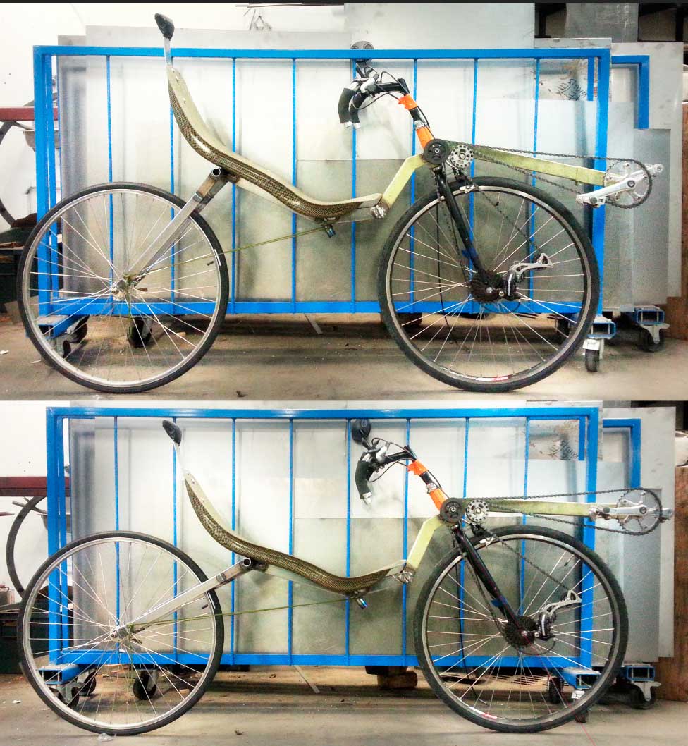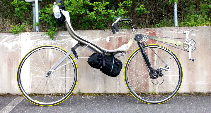 Pyörähän ei ole tässä ihan ajoasennossa. Hiukan se takaosa joustaa alaspäin. Pitää pestata joku kuvaamaan kuskin kanssa.