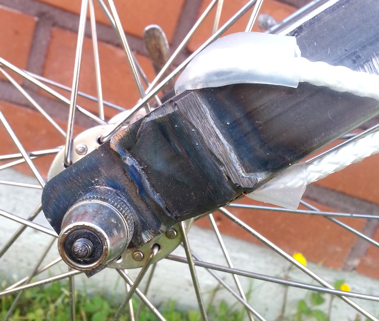 Hirveetä natinaa on kuulunut Kuudee Sportista kun olen ajellut sillä pari lenkkiä. Rakkineen joustavin kohtahan on siinä takahaarukan liitoksessa. Siistin sitä vissiin kiihkoissani liikaa ja nyt siinä on selkeitä halkeamia. Ajattelin korjata sen - vähän kun putsais ja hitsais ni se olis OLLU siinä.