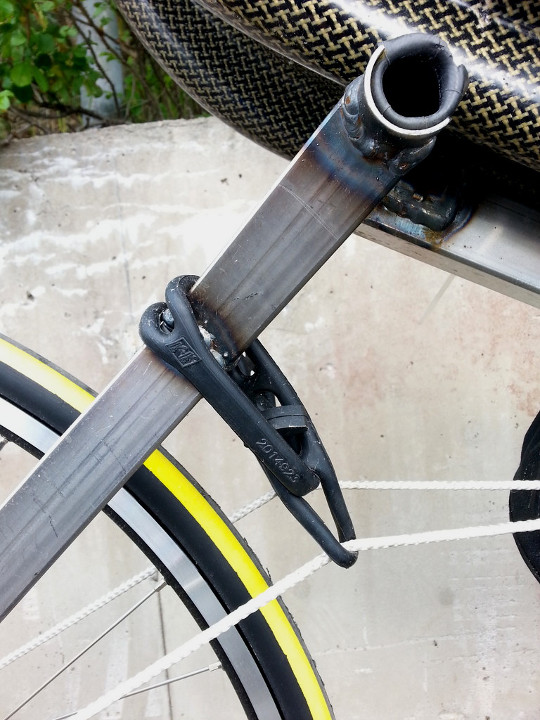 Narukiinnitys takana. Putki haarukkaputken läpi pystysuunnassa ja kumiputki narun suojana.