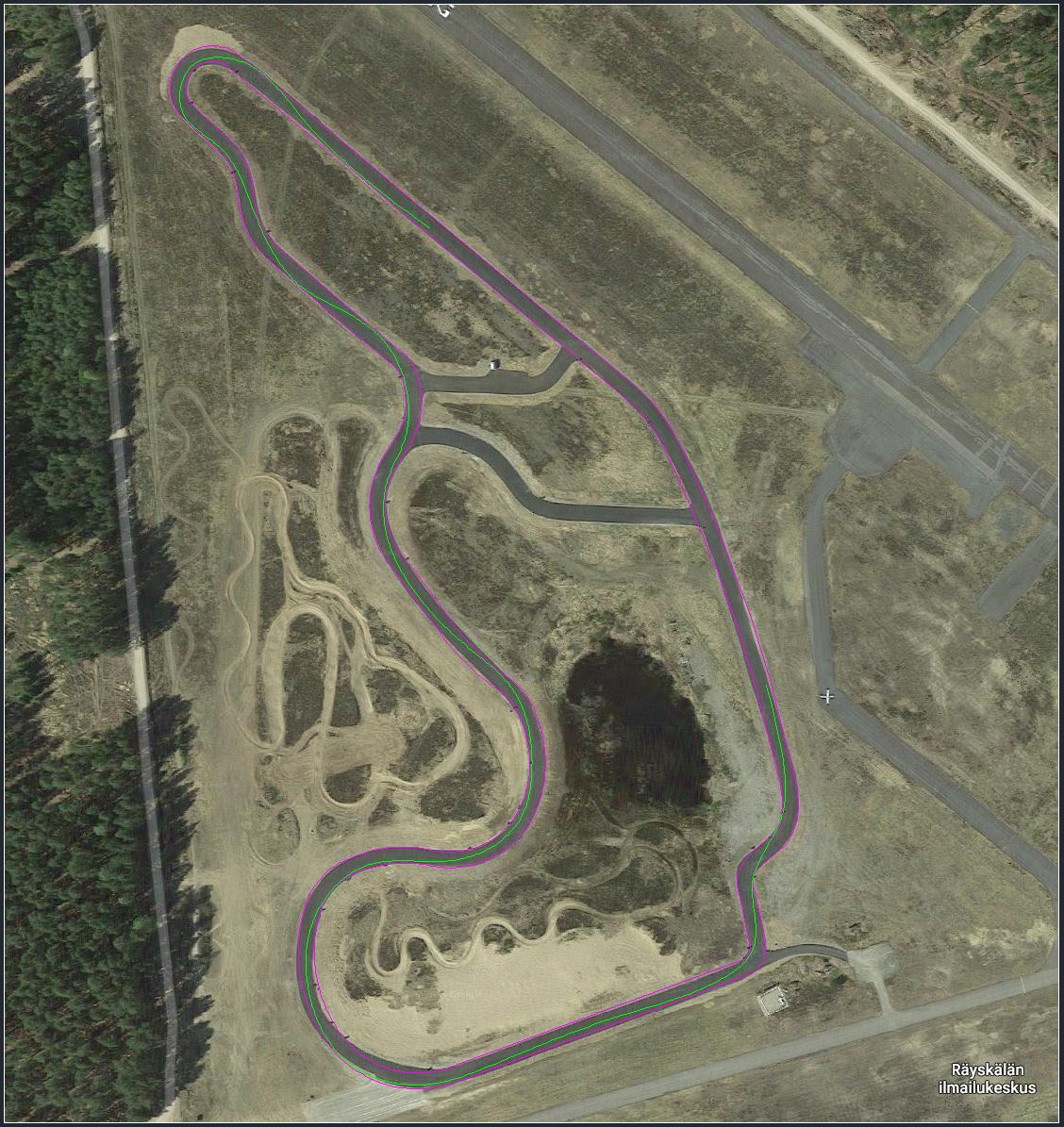 meanders on the track to keep a high speed ask for moving from left to right and back at each meander, this can be a problem when a faster participant comes from behind. green - fast trajectory