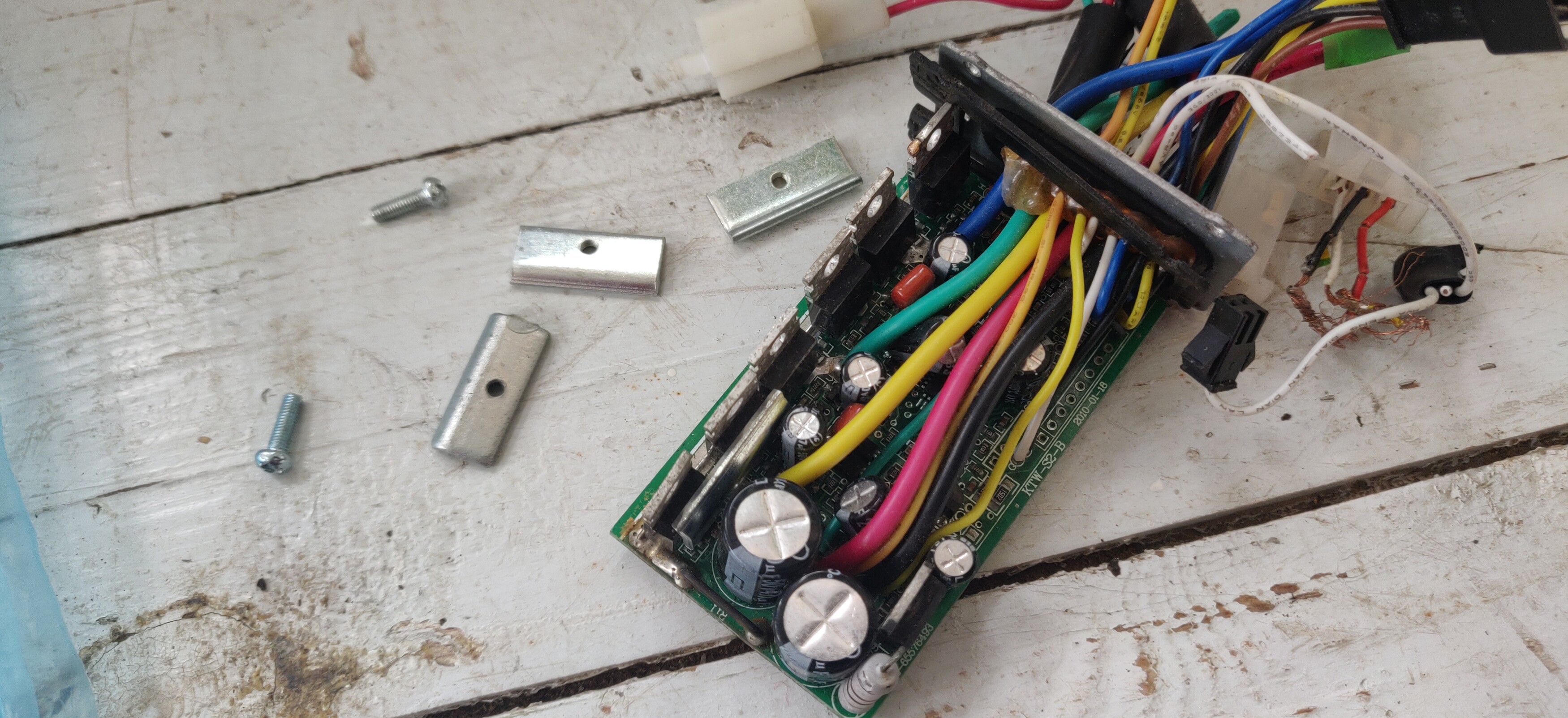 Neljä tommosta metallilevyt, yksi on tuossa vanhassa kontrollerissa luultavasti oikein paikallaan. Kuvan pulteilla ne oli kiinni, kotelon läpi - levyssä kierre. En tiedä mikä noiden tarkoitus on, tukeeko ne vaan tuota "palikkarivistöä"? Poika epäili, ett ne jäähdyttää noita osia? Pirun vaikeeta laittaa paikalleen, äkkiseltään tuntuu jopa mahottomalle