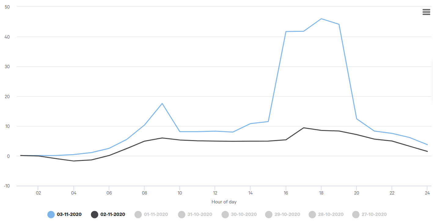 Halpa sähkön hinta johtuu erittäin halvasta tuulisähköstä, jota puhaltuu markkinoille. Suosittelen kaikille tuntikohtaista pörssisähkösopimusta, niin näistä tuulisista syyspäivistä saa iloisen mielen ![]()