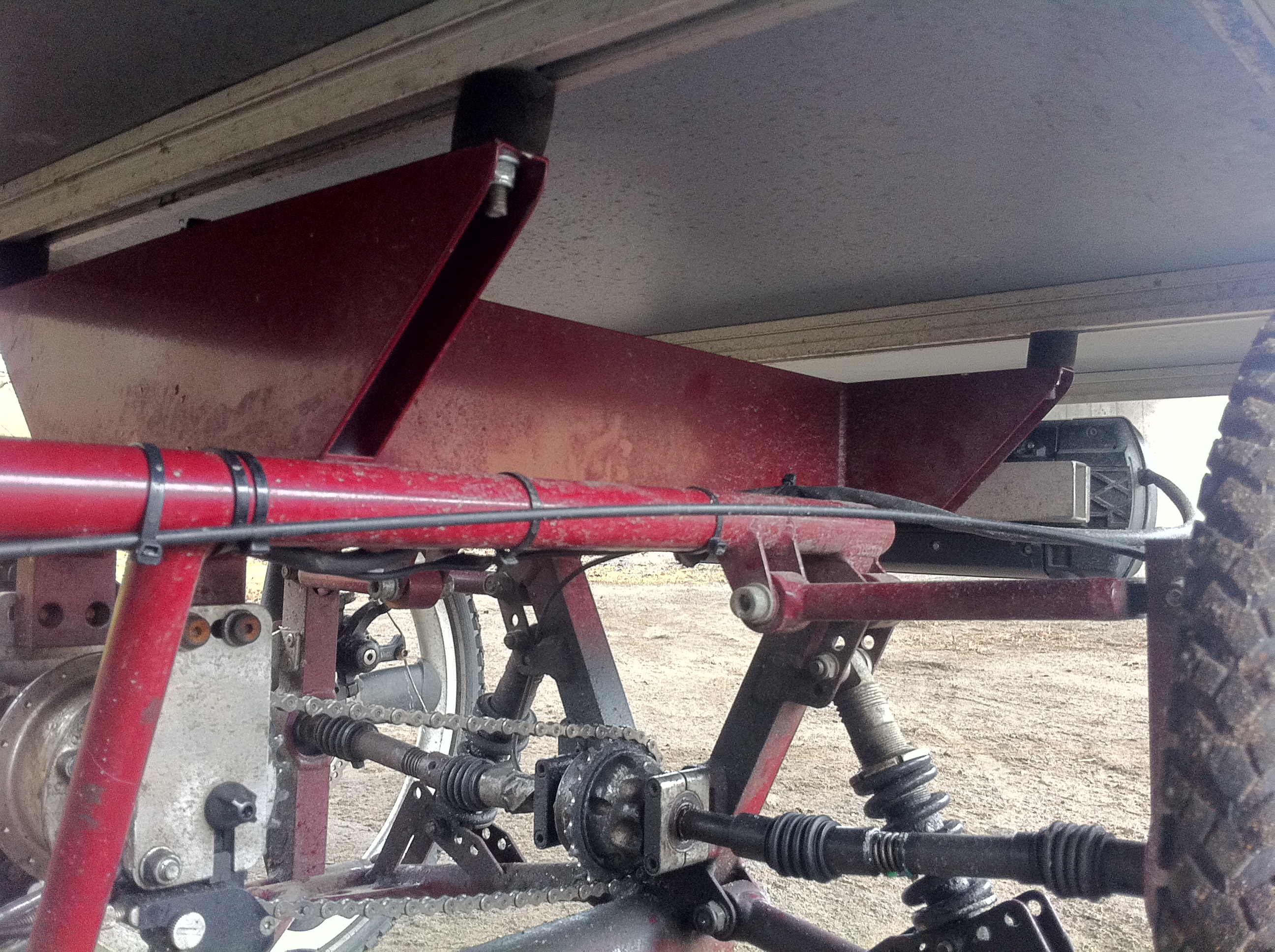 Heilurivarsi, jousituksen sisäputken ulkopäässä on laakeripesä, johon väliakselin ulompi laakeri menee. Vahvistan heilurivartta vielä kolmiorakenteella. Silloin hukataan kyllä tavaratilaa, mutta muuten tuonne liitokseen tulee aika kovia voimia.