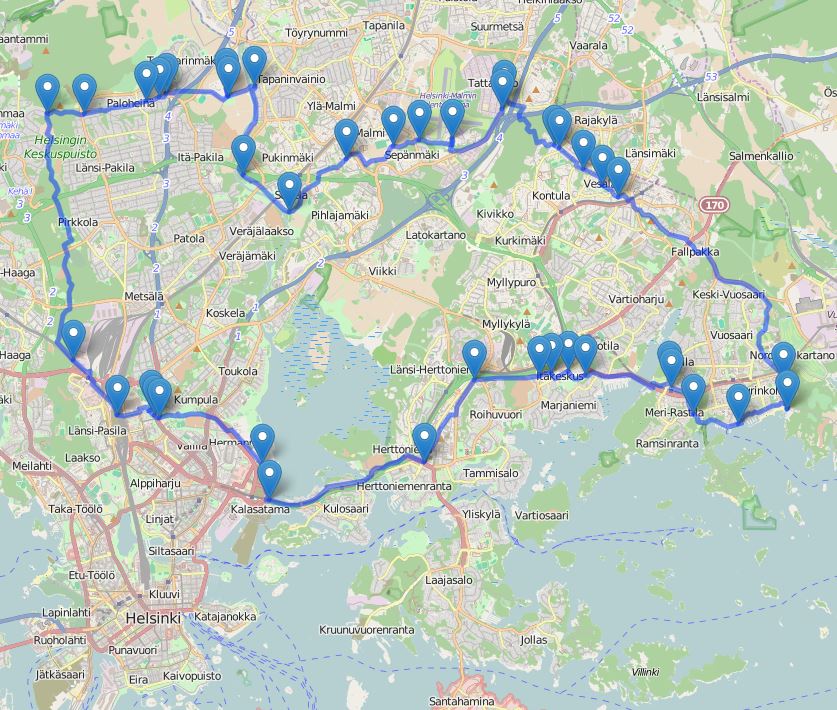 Kiitos näistä. EDIT2: Entäs jos lähtis siitä noiden Wackyn ehdottamien reittien alkupään itävälän alituksesta toiseen suuntaan ja sitten vuosaaren keskuspuiston läpi? Näin: http://bit.ly/1J7FbbJ Meneekö vaikeaksi, olis puistoa suuren osan matkaa?