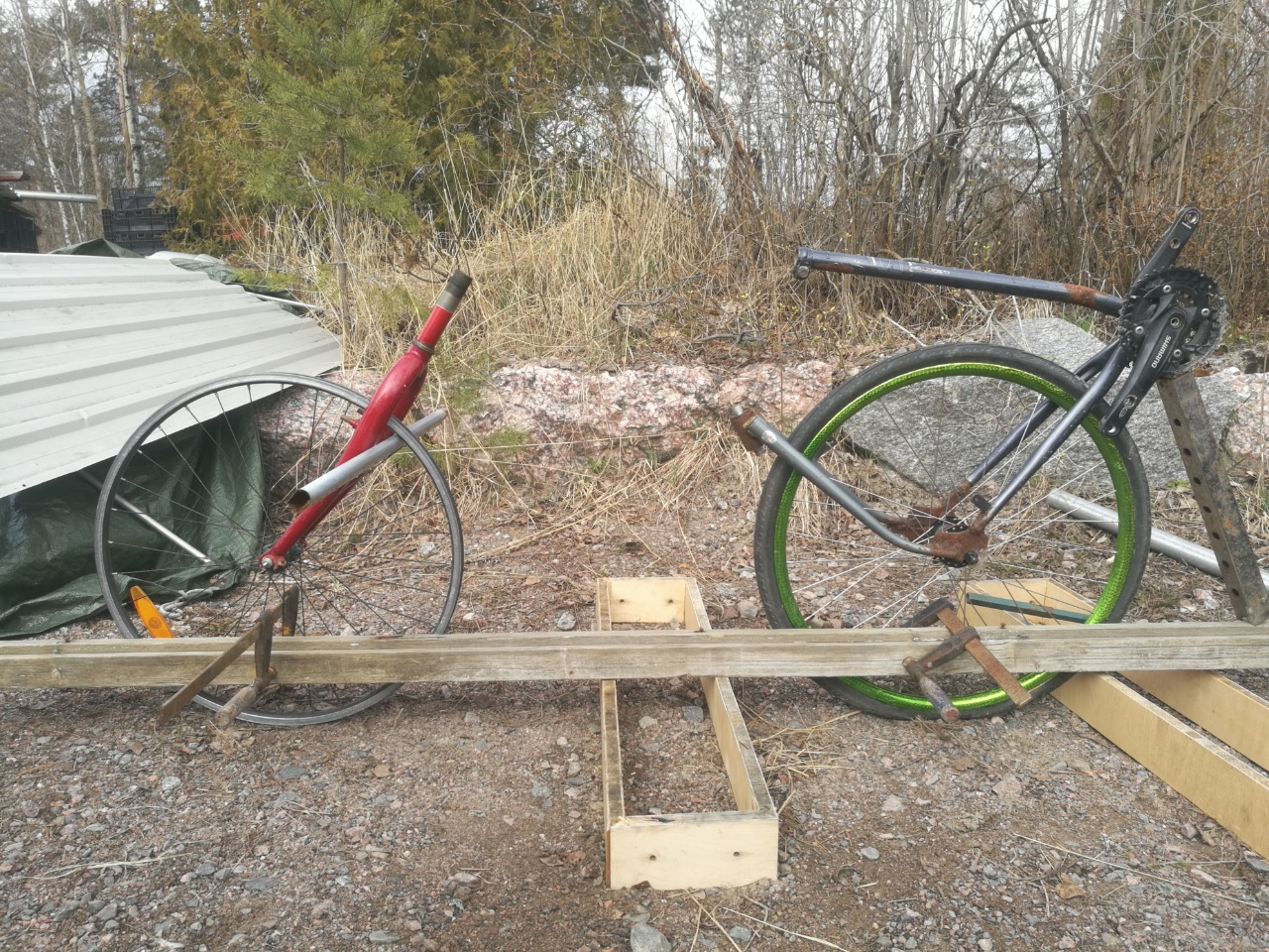 Muistathan huomioida, että molempien kiekkojen keskitasot ovat samassa tasossa, ennen kuin kyhäät rungon tuohon väliin, jotta tulee suora. Jos rengas on paikallaan, pitää ainakin ilma olla pois, jotta tukee vanteen reunaan, ja vanteet yhtä leveät.