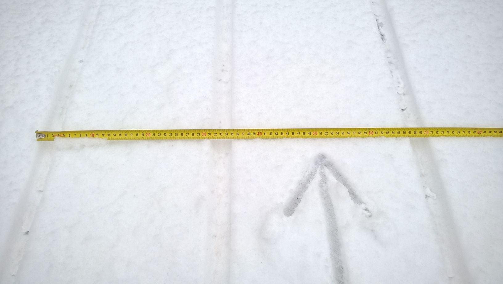 Sitten nyt kun tuota lunta on niin sitä voi hyvin hyödyntää esimerkiksi kuvan mukaiseen mittaamiseen. Koitin siis ajaa mahdollisimman suoraa tuossa kohdassa (nuoli osoittaa ajosuunnan), joten taitaa se tosiaan niin olla ettei ainakaan omassa DF:ssä ole takakiekko pyörän keskilinjalla. Tiedä sitten onko se tarkoituskin, vai onko kyse rakentamisen aikaisesta epätarkkuudesta. Äkkiseltään ei tule mieleen mitään syytä miksi kiekko tarkoituksella laitettaisiin sivuun keskilinjasta tässä tapauksessa, tuleeko jollain muulla?