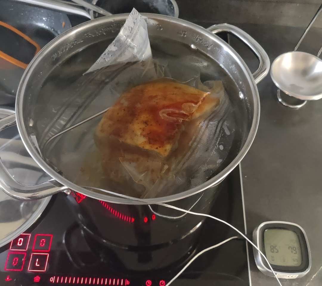 Kun ei meinaa muuten tulla tarpeeksi mikromuoveja, niin aattelin kokeilla sous vide menetelmää. Lämmitin veden 85 asteiseksi, possun ulkofile kyytiin ja sitten lieden lämpimänäpitotoiminto päälle. Veden lämpö laski aluksi 72 asteeseen ja on vähitellen noussut 5 tunnin aikana 79 asteeseen. Jos vielä pari tuntia pitäis ja pikajäähdyttäis kylmässä vedessä. Yöksi jääkaappiin ja huomenna paistaa pintoihin värin. Saa nähdä onko hyvä. En oo ikinä maistanut sous vide lihaa.