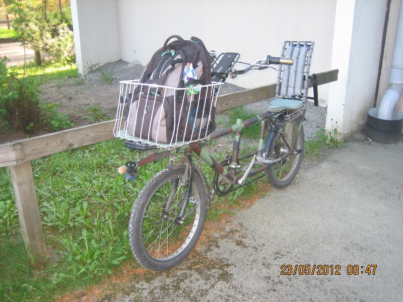 Ranskan foorumilta löyty MBB-tandemi, aikamoinen putkihässäkkä. Tuli vaan mieleen, näinä "naruperäaikoina" - eikö tuommosen tandeminkin vois toteuttaa narukiinnitteisenä? Nivel niskojen väliin ja naru penkin alta penkin alle. Jos tarttee joustoa ni kumia väliin.