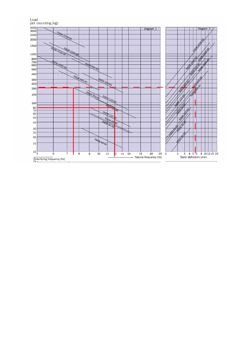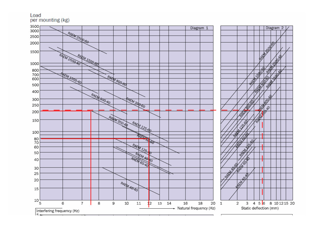 Staattinen jousivakio saadaan valitsemalla oikeasta reunasta kuormittava massa, vetämällä vaakasuora viiva oikeaan kuvaan ja lukemalla vaaka-akselilta puristuma millimetreinä. Staattinen jousivakio on punaisten katkoviivojen speksaamalla eristimellä sallitulla maksimi kuormalla noin 200 kg x 9.81 N/m2 / 0.0058 m = noin 338 000 N/m. Dynaamiset jousivakiot saadaan vasemmasta kuvasta lukemalla ominaistaajuudet (natural frequency) ja kuormittava massa. Eli maksimikuormalla 200 kg ominaistaajuus on noin 7.5 Hz ja minimikuormalla vastaavasti 80 kg ja 12 Hz. Dynaamiset jousivakiot saadaan 200 kg x ((2 x pii x 7.5 Hz)2) = 444 000 N/m ja 80 kg x ((2 x pii x 12 Hz)2) = 455 000 N/m. Eli esimerkin eristimellä (RAEM 350-40) dynaaminen jousivakio on vain vähän kuormituksesta riippuva ja noin 1.3 kertaa staattista jousivakiota suurempi (eristimessä leikkausmuodonmuutos).