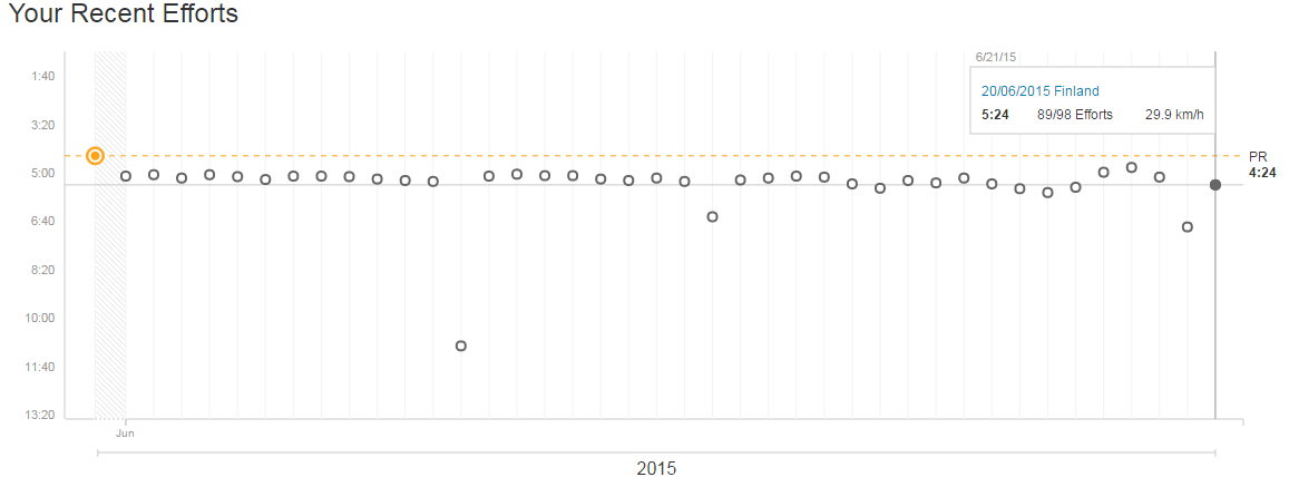 Nopein kierrosaika oli 4:24 joka vastaa 36,7km/h keskaria.
