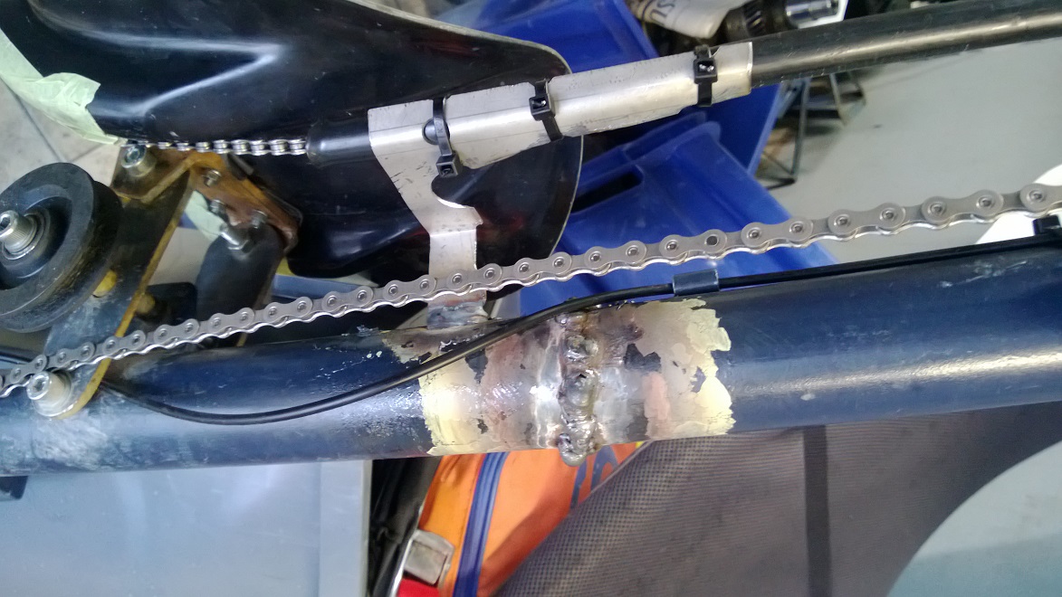 Ketjusuojaputkelle hitsasin kiinnikkeen, nyt tuli lankaa tasaisesti niin siitä ilosta kiinnike on jokapuolelta hitsattu :) pikkasen parempaa saumaa kun toi runkoliitos. Bussitehtaan jätelavalta dyykasin kaikkea raudankappaleita ja tossa oli kulmatkin melkein kohallaan niin ei tarvinnut kuin rälläköidä irti.