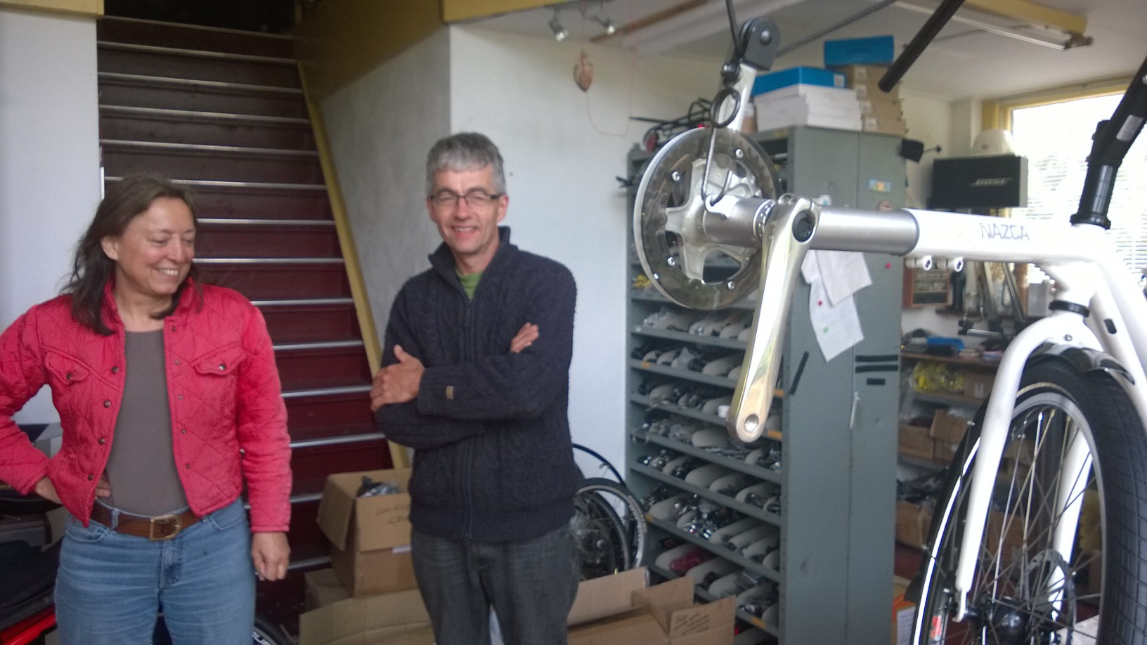 Poikkesin Nazcan pikkutehtaalla Nijeeveenssä 2014. Kaikki rungot tulevat alihankijoilta. Kokoonpano tapahtuu siis tuolla Nijeeveenssä. Pyöräni Nazca Fuego oli auton telineessä. Olin jo silloin asentanut Bionx sähköavustimen pyöräni ja valmistaja mielellään tarkisti asennuksen. Ja kertoi myös ajaneensa aikoinaan tällä minun pyörälläni testilenkin! Fuego n runko on alumiinia!