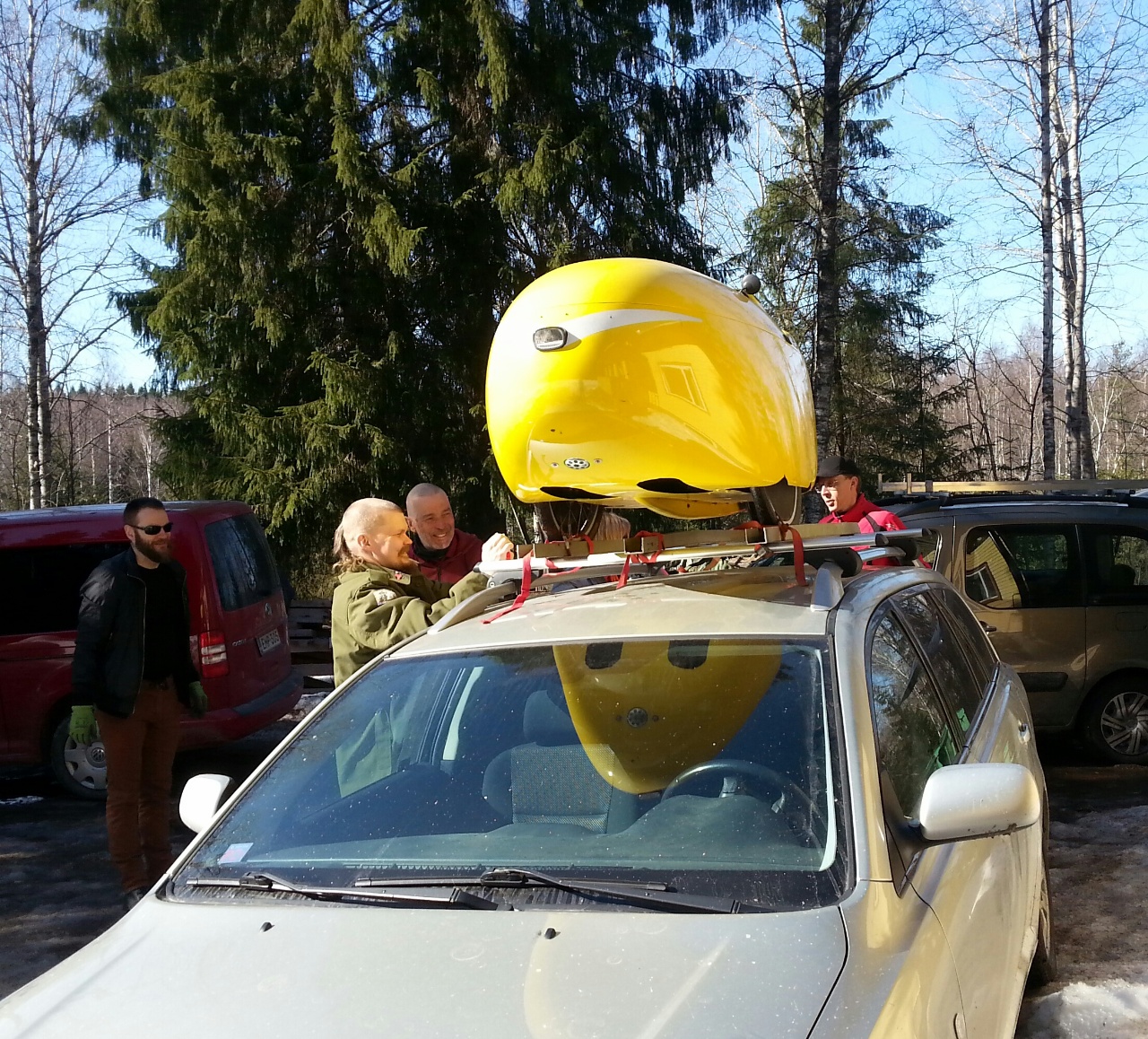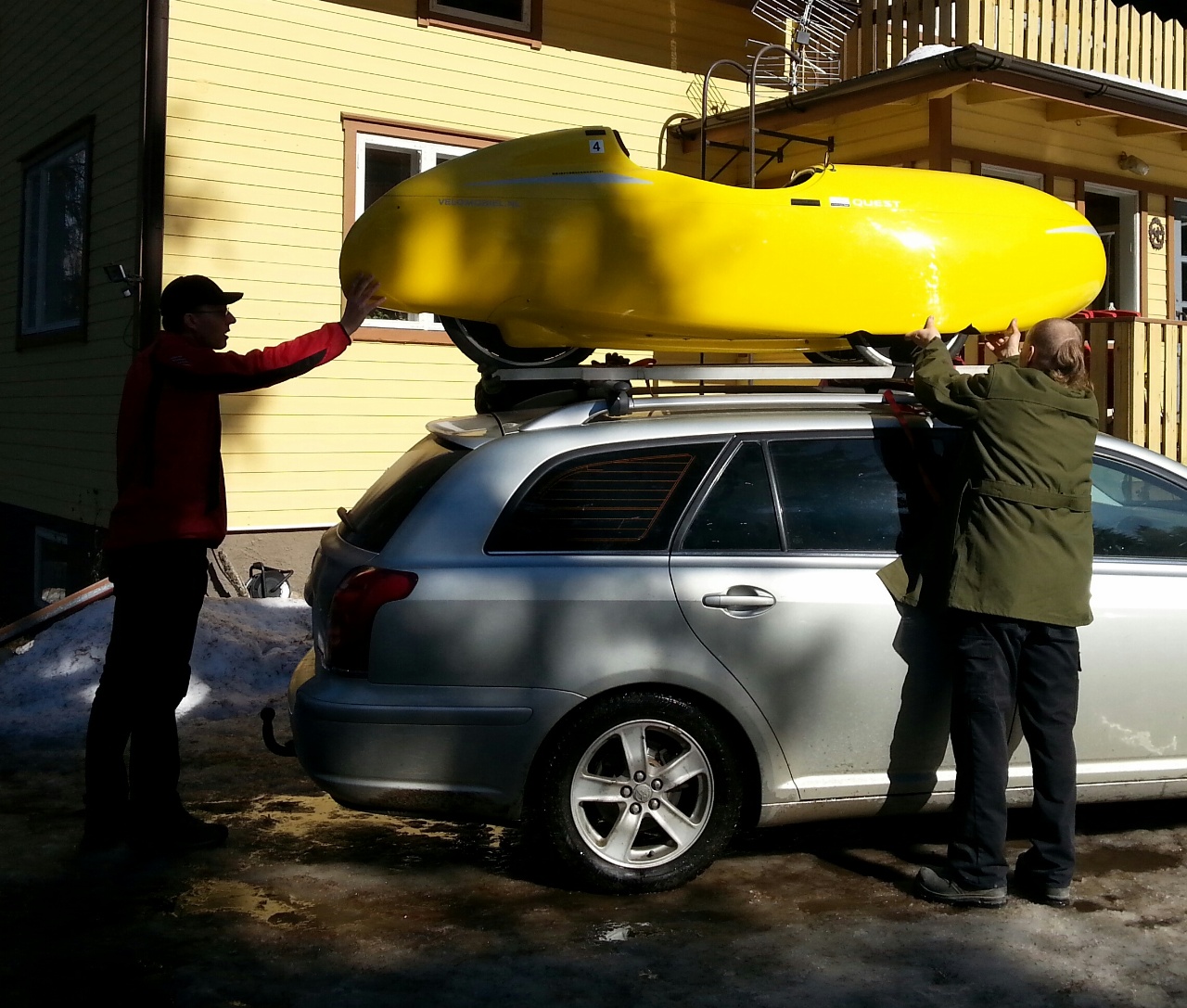 Kuljetus sujui avensiksen katolla hyvin, 3alumiinikouruun sidoin kiekot ja yks liina aukon kohdalta ympäri. Lastauspäässä oli useampi nostaja. Aamulla kotona kattelin, mites tuon alas sais, kaivinkoneella nostaminen vaikutti ylimitotetulta. Laitoin sitten maton tuulilasille ja konepellille, Quest tuli nätisti vetämällä alaspäin ja aukon reunoista nostaen loppumatka.