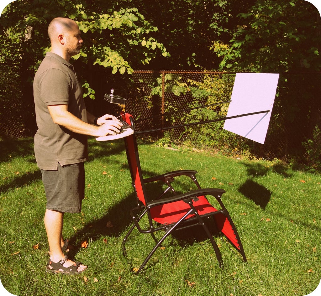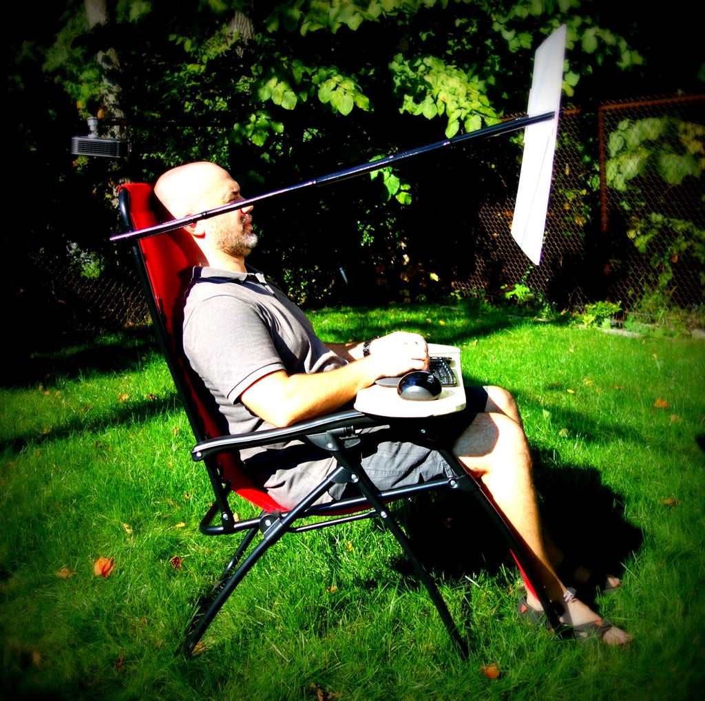 Joku muukin on havainnut, että aurinkotuoli on edullinen tapa päästä mukavaan työasentoon. Minulla on tuossa kokonaisuudessa samanlainen tuoli käytössä. Tämä tosin on kehittyneempi versio. Hän on ymmärtänyt, että ei tarvitse raskasta rakennetta, joka jaksaa kannatella isoa näyttöä, kun heijastaa kuvan pään takaa videotykillä. Nerokasta. Samaa työpistettä voi käyttää myös seisten. Odottelen vain sitä päivää, kun työantajat ymmärtävät tämän arvon. No etätyöt ovat nykyään niin yleisiä, että siellä sentään saa päättää työpisteensä asennon itse.