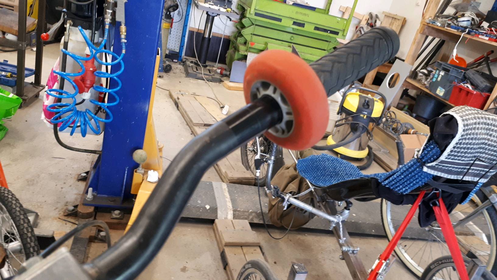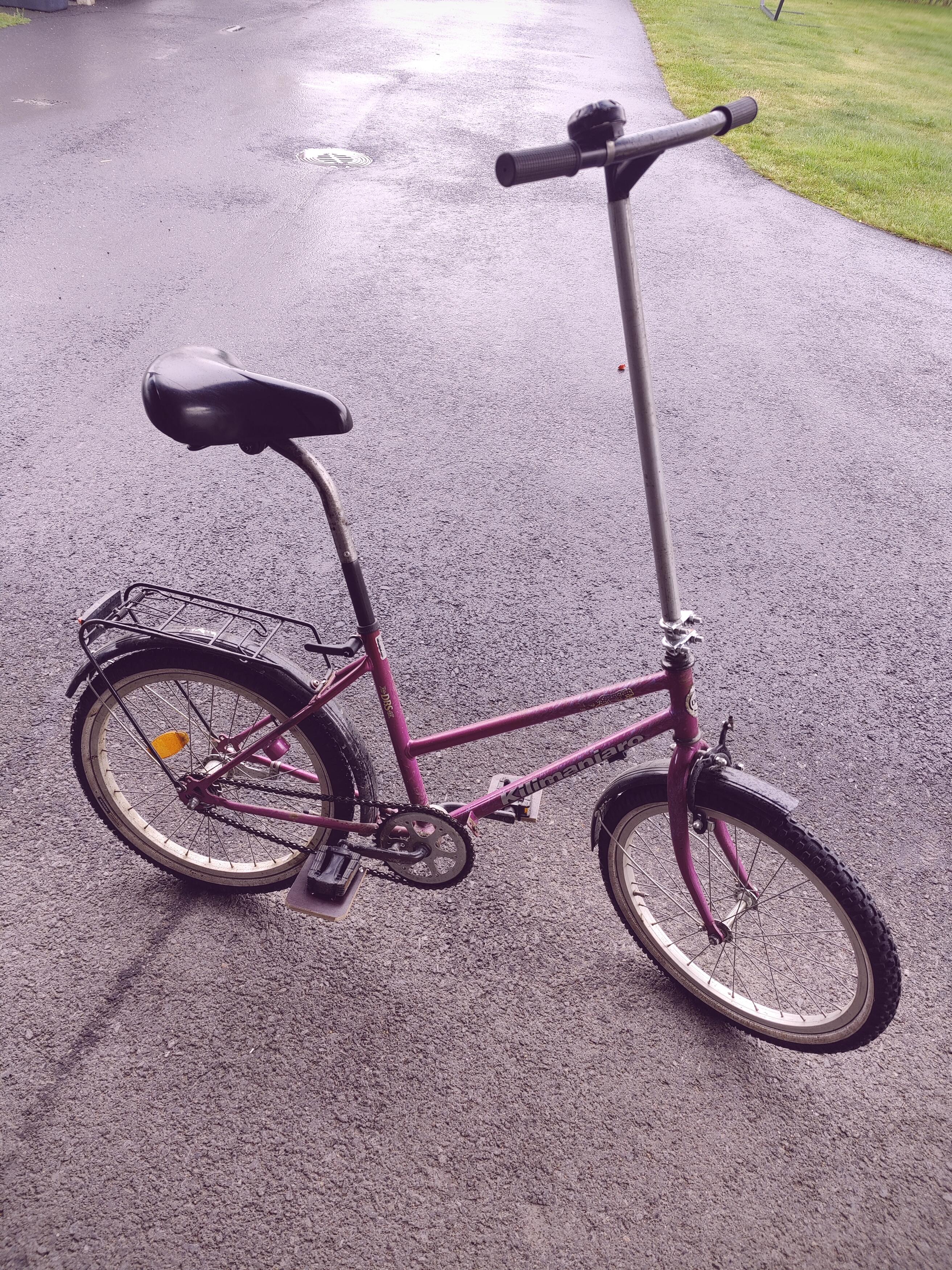 Penkin putkessa näkyy popniittiliitos keskivaiheilla. Siinä on kaksi lastenpyörän penkin putkea, halkaisija 25,4mm joka kaventuu päästä parin-kolmen sentin matkalta istuimen kiinnitystä varten 22,2 milliseksi. Putket menivät kevyesti naputellen sisäkkäin ja popniitit saumaan. Alempi on alumiinia ja ylempi terästä.