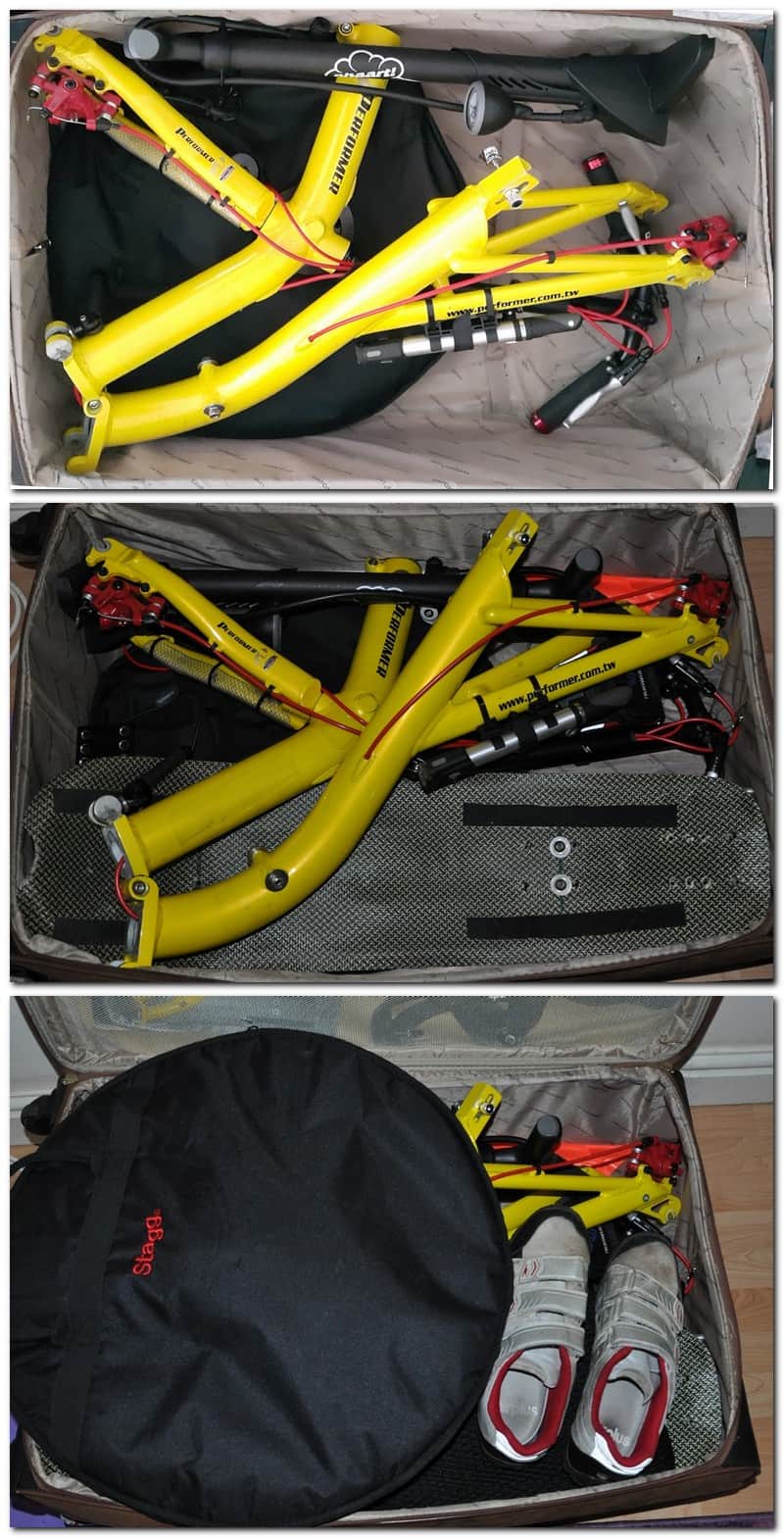 Harmillisesti joutuu ottamaan kiekoista renkaat irti. Isoon matkalaukkuun menisi paremmin, mutta se on kova ja painava, jolle pitäisi miettiä joku säilytyspaikka. No varustekassiakaan ei ehkä kannata raahata koko reissua mukana, mutta se menee kasaan.