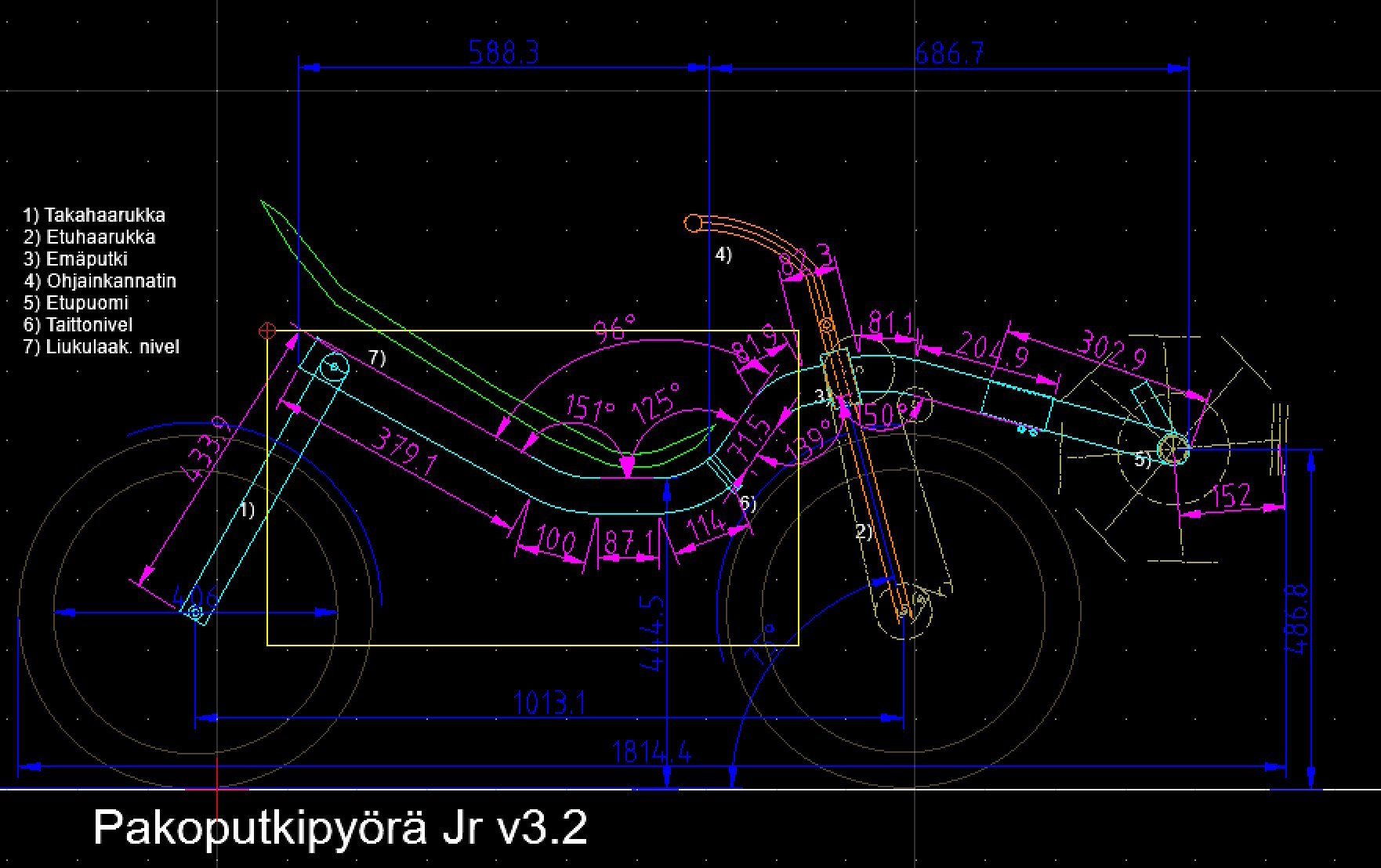 v2: toin emäputkea taaksepäin, nosti runkoa, jotta sain tilaa etukiekon ja emäputken väliin ja muutin ohjauksen kulman 75 asteeseen