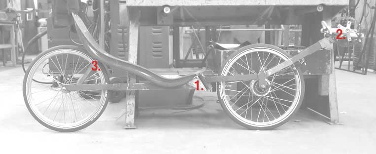 - Kuudeesta periytän tuon siirrettävän poljinkeskiön. Tähän tulee sinkulakiekko - jonkinmoista pikku säätöä siis tarvitaan. Samalla lähti kiinnike ketjunkiristäjälle.