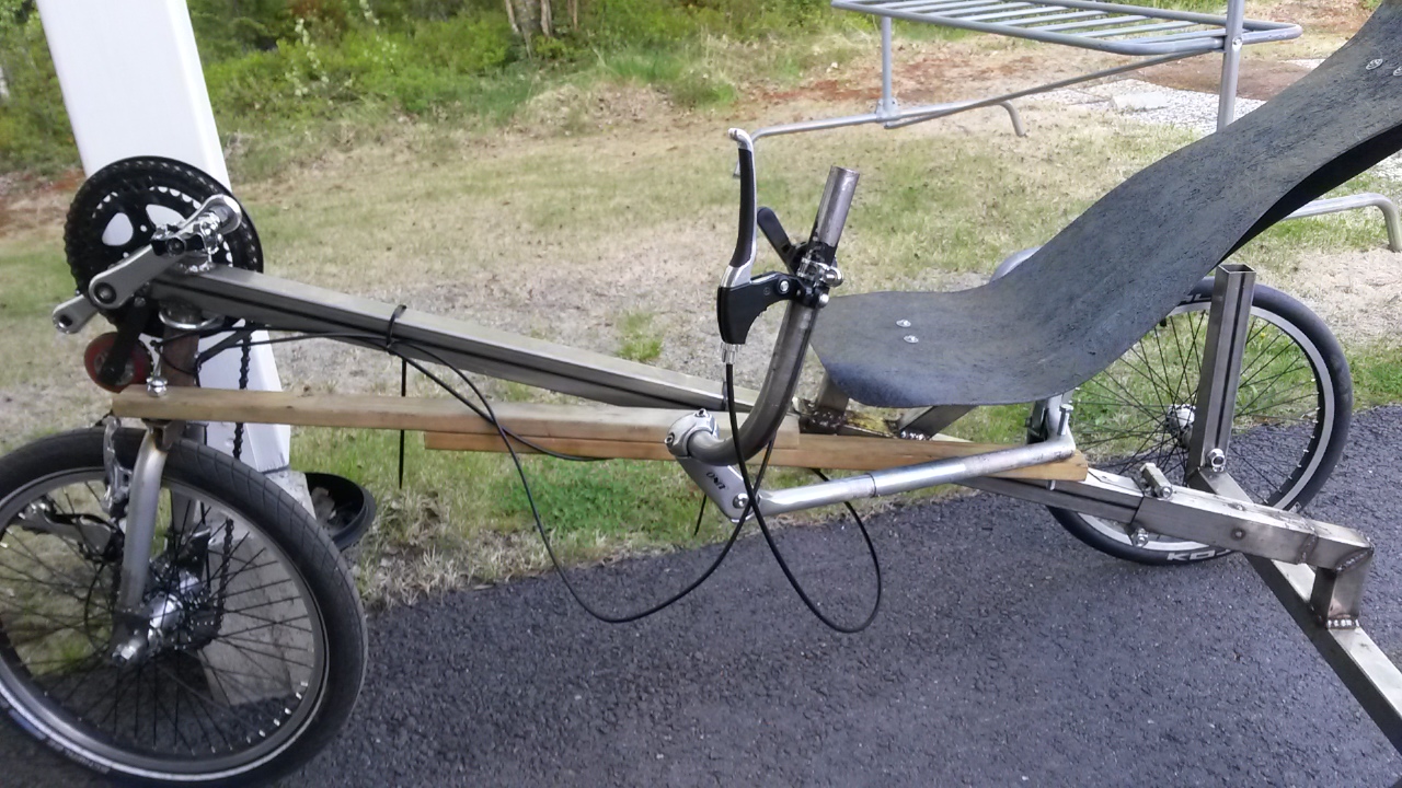 Alaohjaus väliaikaisilla ohjaustangolla ja puisella raidetangolla. Pyörän ajettavuus parani ihan dramaattisesti verrattuna pitkään tilleriin. Nyt ohjaus puoltaa tien kaltevuuden suuntaan, kuten pitääkin. Enää ei pelota mutkiin ajelu. Yllättävän paljon tuli kettwieselin oloinen ajotunnelma.