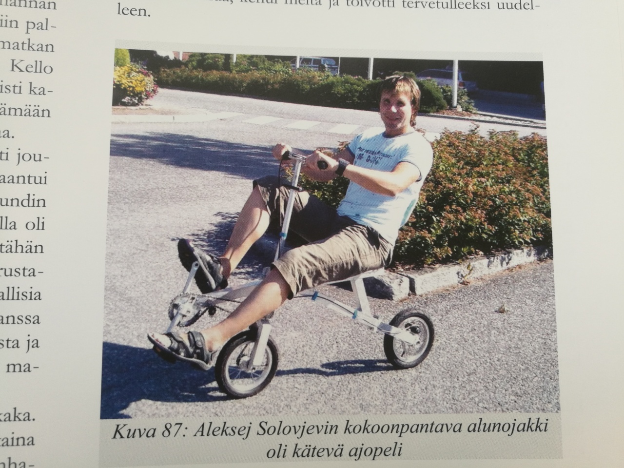 Kävin kirjastossa selailemassa Olli Kuusiston kirjaa "Aurinkoautosta velomobiiliin", sattu silmiin kuva kovin Dumbon näkösestä pyörästä ;)