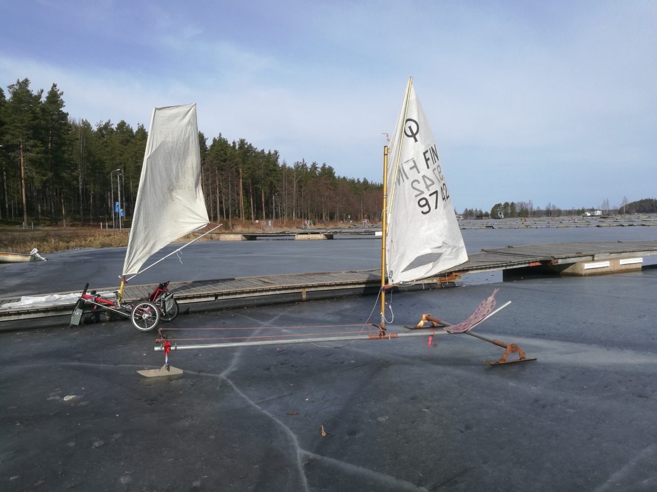 Ysiksi kerkesin jäälle, hyvä jää, hyvä tuuli. Ekaks purjeHasella, laitoin siihen optarin puomin ja kädellä jalustin. Kyllä kulkee, välillä puuska saattaa heittää sivuluisuun mutt näppärä kuski oikasee nopeesti ja käännöksissä polkemalla auttaa alkuliikkeen. Kapee siipimäinen purje olis tähänkin paras.