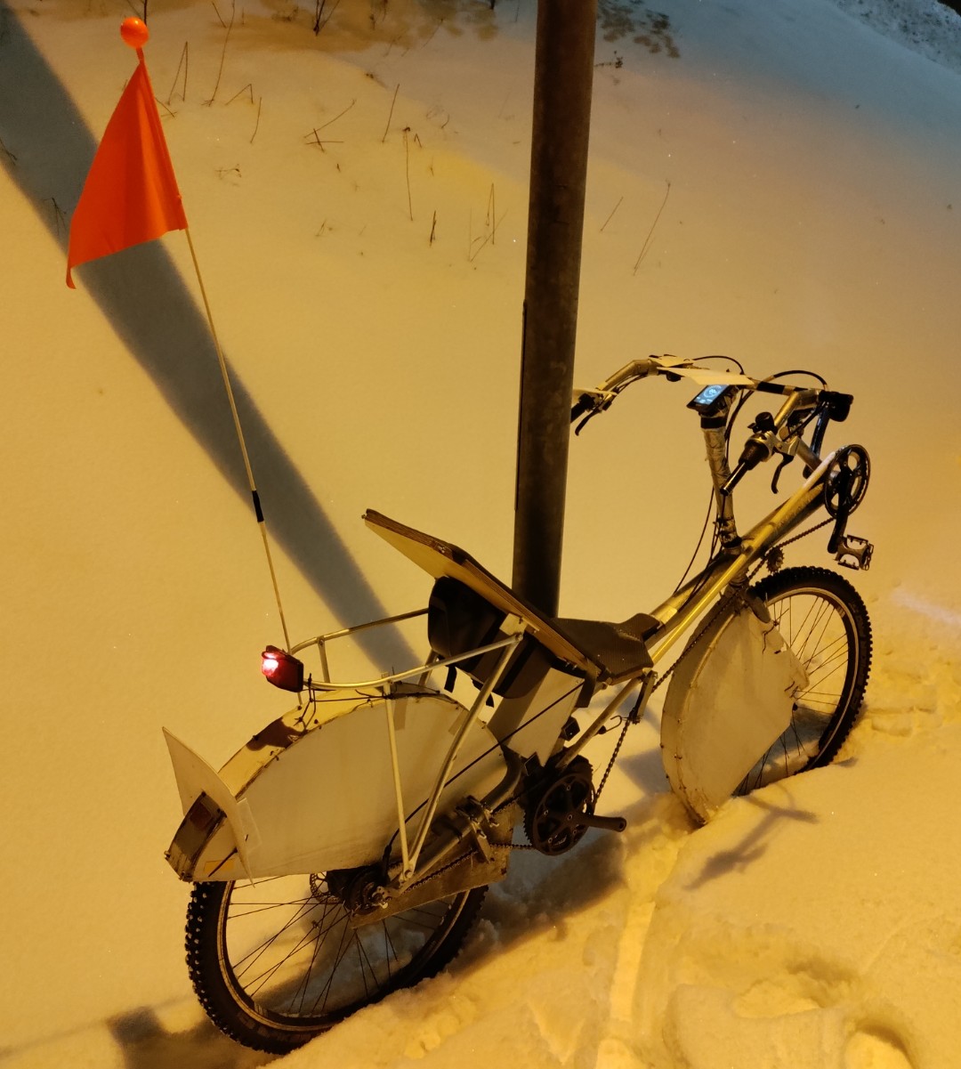 Lisäyksinä lippu ja pyörän sähköillä toimiva pieni takavalo. Kunnes posti tuo sen jännitteenmuuntimen ja pääsen asentamaan lisää valoja.