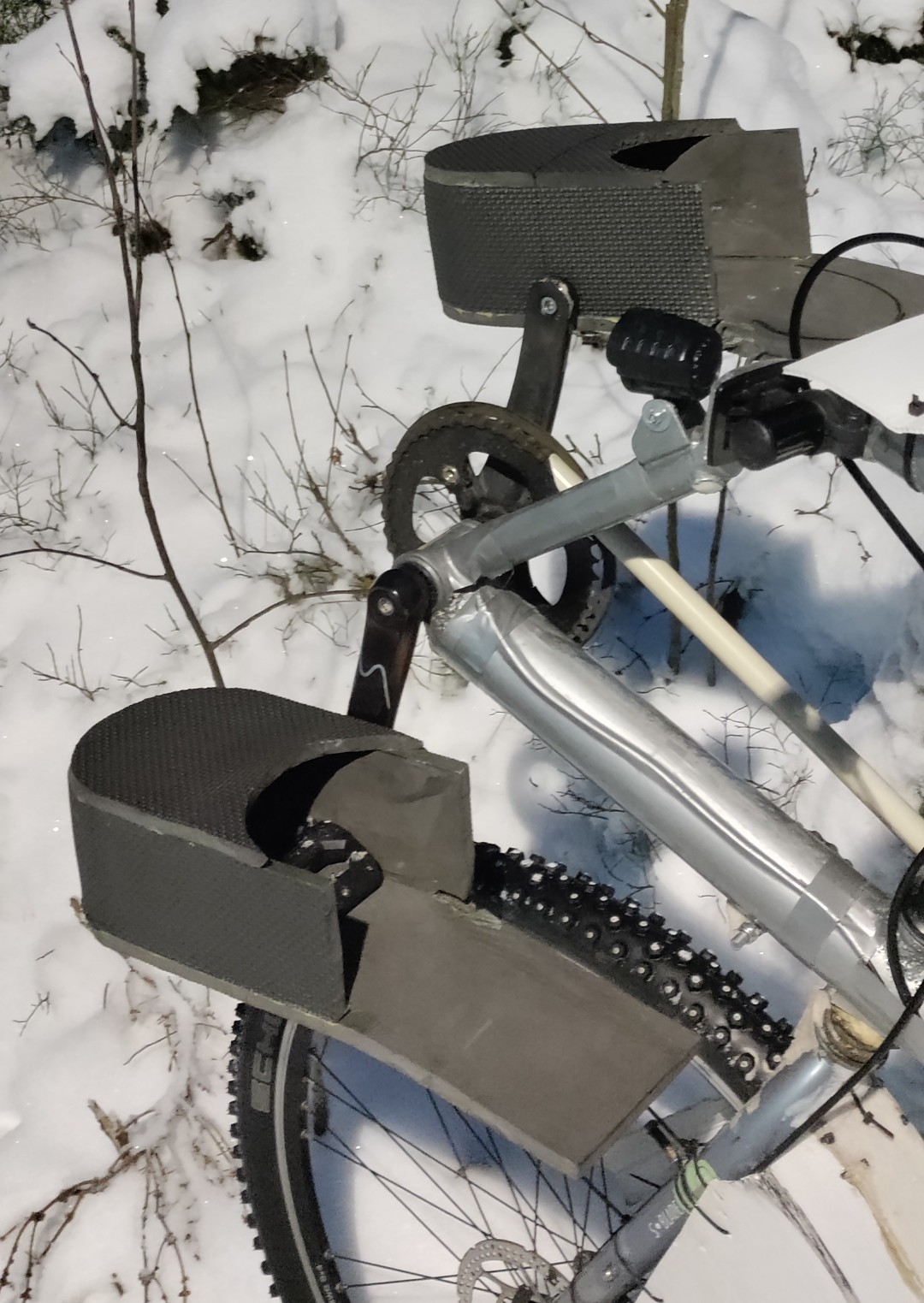Tein jumppamatosta polkimiin kiinnittyvät kengänlämmittimet. Ihan toimivat pienen koeajon perusteella, mutta tuo alaläppä ottaa helposti kiinni eturenkaaseen ja kärsii joka kerta vähän. Lämmittävätkö nämä sitten... huomenna selviää.