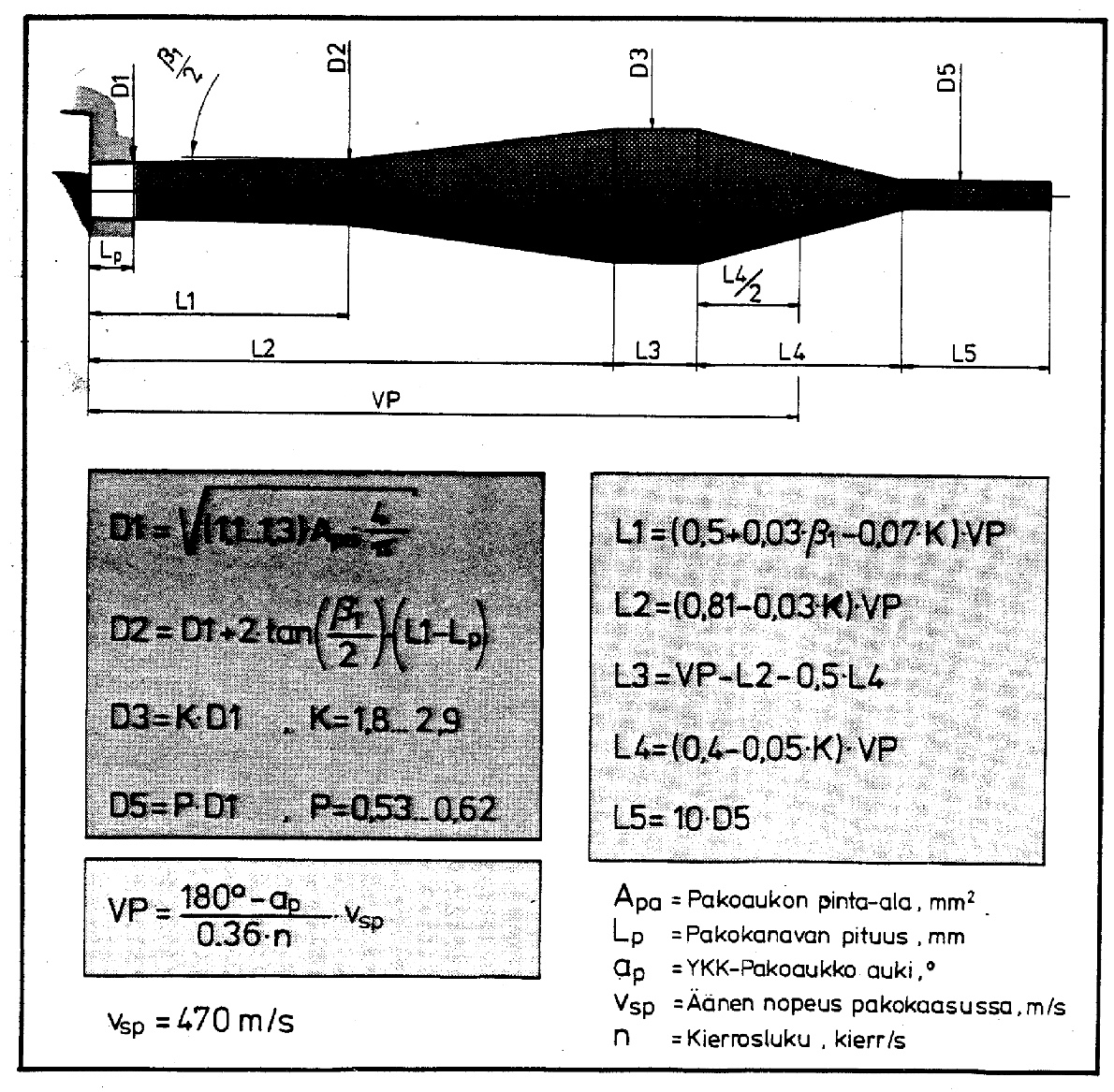 Tuossa (Seppo Tiitasen motocross-mekaanikon käsikirja 80-luvulta) pakoputken laskentakaava. Pitänee verrata tuloksia laskureihin. K on kerroin alkukäyrän ja keskilieriön suhteesta. Pienemmällä suhteella laajempi tehoalue, suuremmalla enemmän huipputehoa. Vastakartion pituudella samanlaiset vaikutukset, pitkällä laaja tehoalue, lyhyellä piikkimäinen huipputeho. Vastakartiota voi Tiittasen mukaan pidentää vaikka kuinka pitkäksi, kun halutaan laaja tehoalue. Rajoitteena lähinnä (moottori)pyörän pituus. VP on viritetty pituus.