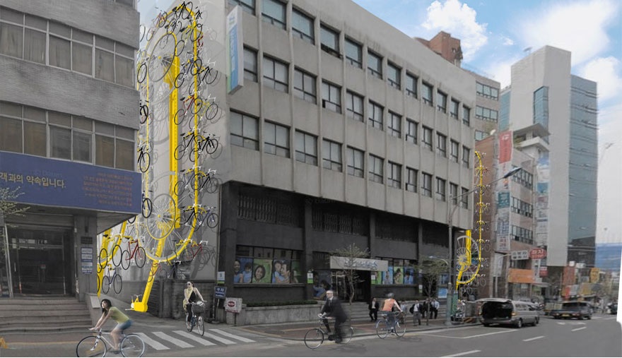 Arkisempi ratkaisu olisi muuttaa joku pysäköintiruutu pyöräkatokseksi. Reunimmainen ruutu niin saisi pitkän sivun auki. Ruudun koko on kai noin 2x5m, eli siihen saisi karkeasti viisi metrin levyistä paikkaa. Mahtuu erikoisempikin pyörä ja kinneri.