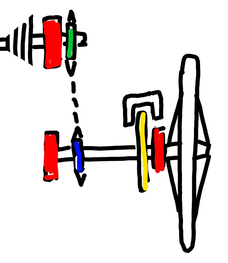 Punaisella laakeripukit, sinisellä vapaaratas, vihreällä kiinteä ratas väliakselilla, keltaisella jarrulevy.Kiekko on kiinteästi akseliin rakennettu, jotta se onnistuu ilman erikoisnapoja. Pitää siis keksiä, miten pyörän akselille kiinnittää vapaarattaan (ja jarrulevyn) niin, että ne saa purettua. Reikä akseliin ja siitä pultti läpi?