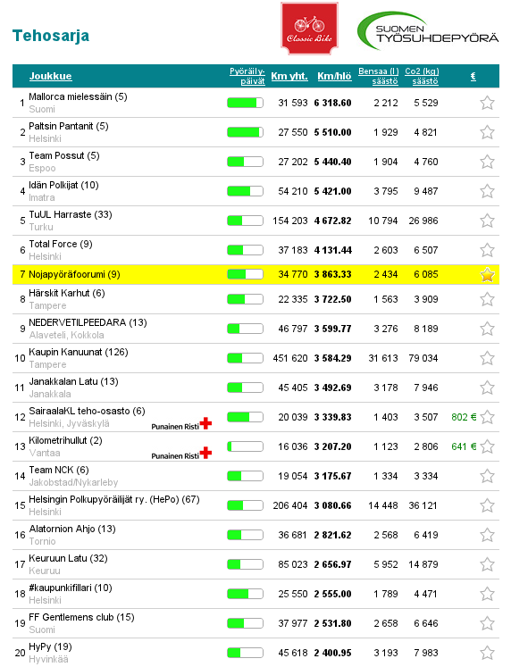 Työmatkatilasto on se missä olisi petrattavaa seuraavaan kisaan, 75% työmatkoista oli tavoitteena ajaa touko- syyskuun aikana mutta 55,6% jäi. Maaliskuun alusta 50,5% ja saisipa vuoden loppuun saakka pidettyä 50*% paremmalla puolella.