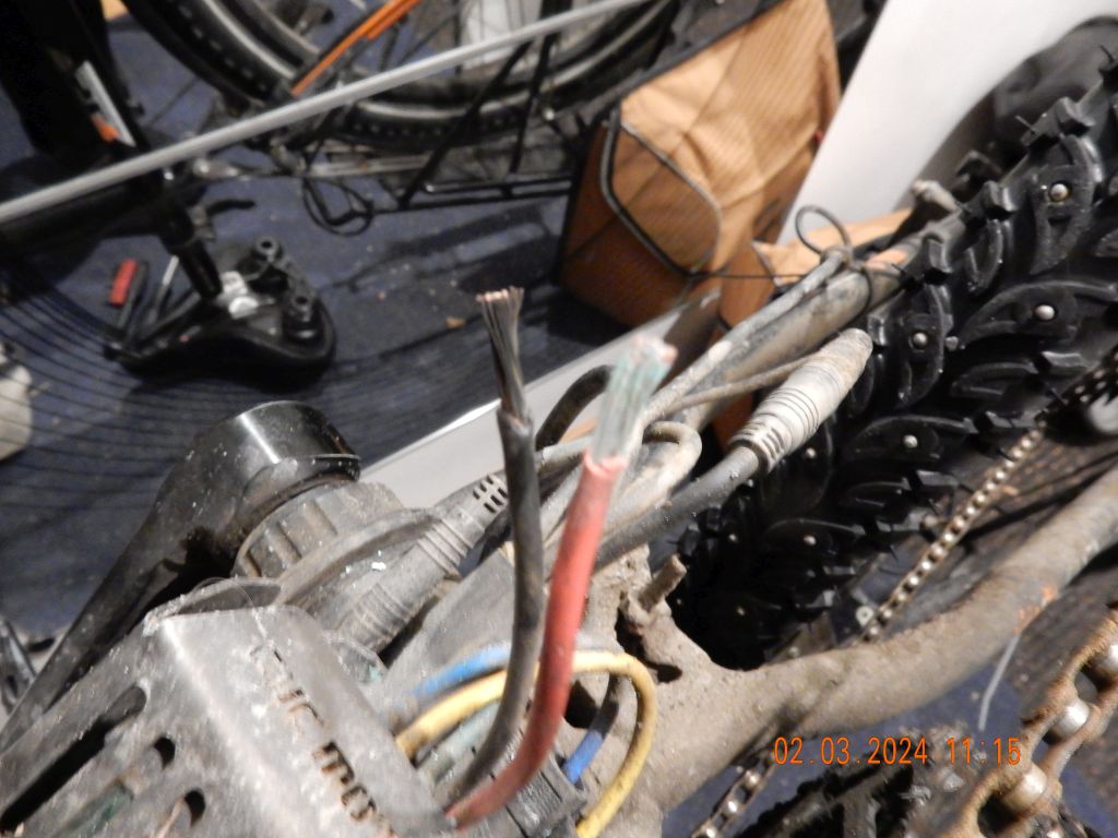 Sähköpyörän akkukaapeli meni yllättävällä tavalla poikki: Korroosio söi plus johdon poikki. Ilmeisesti liittimen sisällä lillui vettä, ja 37V jännite tuhosi johdon elektrolyysillä. Kuvassa näkyy + johdon vihertävä väri, kupari on muuttunut kuparisuolaksi (tai kuparioksidiksi?). Miinus johdossa tummaa pinnoitettua kuparia?