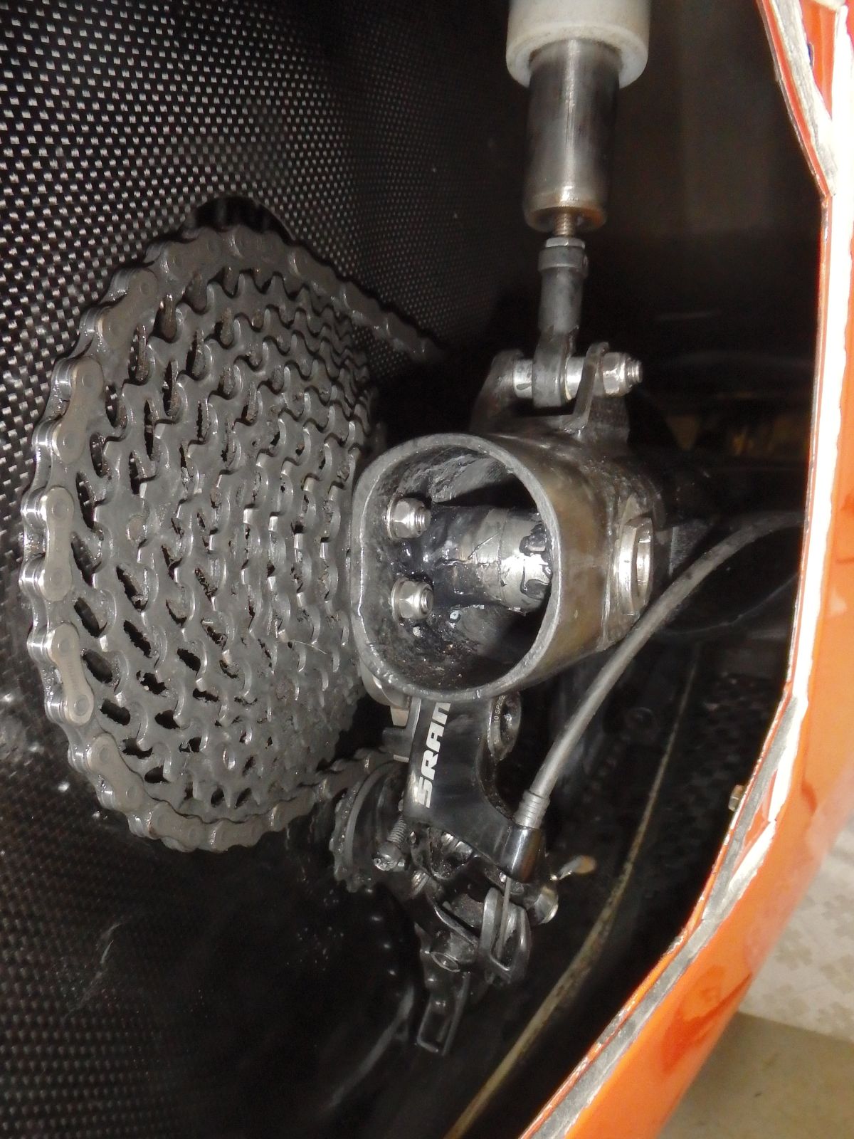Nokian kisoissa olen molemmilla DF:n osallistumiskerroilla saanut palautetta pyörän takapään heilumisesta polkemisen tahtiin. Heilumisen syytä olen sitten ihmetellyt ja lopulta päädyin vahvistamaan ja jäykistämään takahaarukan toisen kiinnityspisteen ympäristöä. Nimittäin kun kädellä tunnustellen se on liikkunut ketjuvoiman mukaan aika selkeästikin. Kyseessä siis takapyöräkotelon puoleinen kiinnityspiste. Toinen ulkokuoressa oleva kiinnityspiste ei puolestaan ole tuntunut liikkuvan. Näin ollen takahaarukka on siis polkemisen tahtiin elänyt ja kääntänyt samalla takakiekkoa ja siten ohjannut koko pyörää. Sain asiaan varmistuksen kun pyysin työkaverin pyörän sisään kampia painamaan ja pääsin itse liikettä tarkkailemaan. Olihan sitä tosiaan yllättävän paljon. Sinänsä tämä on jännä ominaisuus, että liikettä ei itse ajaessa pysty kunnolla havainnoimaan (tai ainakaan en itse pysty), vaan pyörä tuntuu kyllä kulkevan suoraa. Ilmeisesti liikettä oppii automaattisesti kompensoimaan ohjauksella aika hyvin.