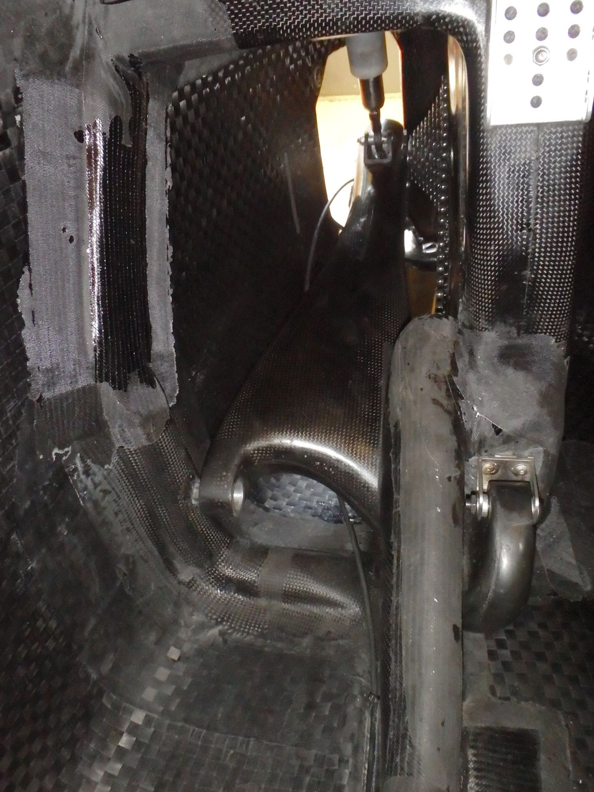 Viikko sitten tuli vihdoin tilaisuus puuhailla pyörän parissa muutama päivä ja laminoin sitten lisää kuitua kiinnityspisteen ympäristöön pyörän sisäpuolelle. Aika hankalaa turaamista se oli kun paikka oli monimuotoinen eikä työskentelyasennot olleet parhaimmasta päästä. Periaatteessa vahvistukset olisi voinut laittaa myös pyörän ulkopuolle aivan hyvin, hieman olisi joutunut maalipintaa hiomaan mutta mitäs se siellä pyörän pohjassa olisi haitannut. Jostain syystä päädyin kuitenkin laittamaan ne vahvikkeet sisäpuolelle. Ohessa kuvia. Ihan tyytyväinen olen lopputulemaan tässä vaiheessa ainakin. MIkään kaunistushan tuo paikka ei ole, mutta haarukan päästä käsin väännellessä tuntuma on selkeästi jäykempi ja myös jarruja vasten polkimista painamalla tuntuma on vähemmän kumipallomainen. Ei se vieläkään täydellisen jäykkä ole, mutta ehkä se pahin joustopaikka on nyt pääsosin eliminoitu. Nyt on siis jännä nähdä kuinka tulevissa Nokian kisoissa pyörä kulkee, vispaako perä vähemmän ja kulkeeko pyörä kenties kovempaa sen ansiosta.