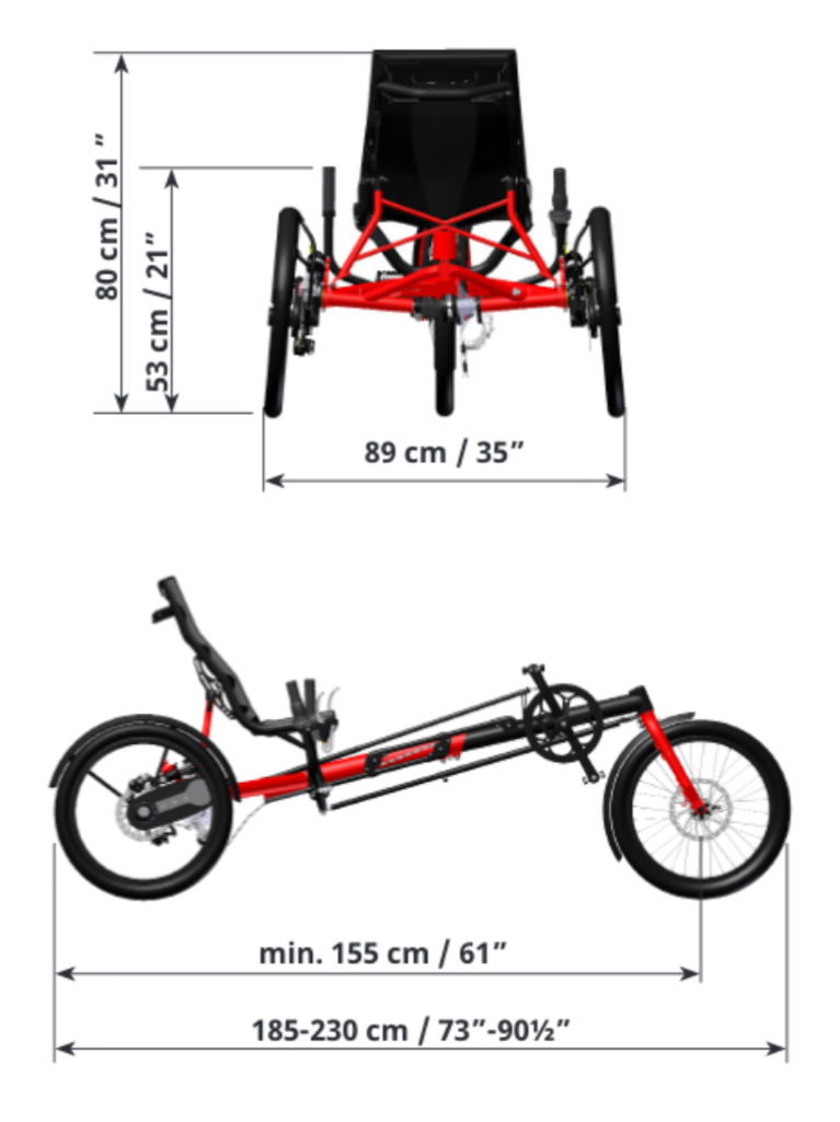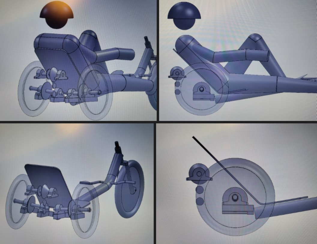 Kyynärpäille ei jää turhaa tilaa. Mallailin tilannetta makaamalla kiekkojen välissä. Siirtämällä kuskia edemmäs tilaa saisi lisää, ja ohjaavalle pyörälle tulisi enemmän painoa. Triken taipumus kaatua taas lisääntyisi. Painopistettä ei voi juuri enempää laskea.